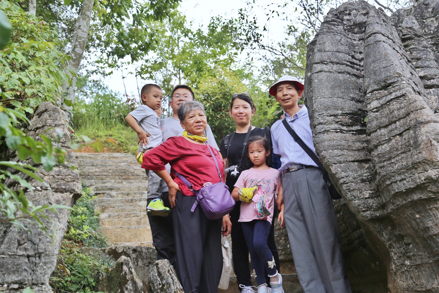 在这石林里,最有意思的莫过于老赵了,在讲解时该唱必唱,能通过唱来表达的决不说,一点也没有觉得害羞一丁点也没有觉得不好意思,整个石林尽是他的歌声。但在莲花寨上的对歌台上当我们六朵金花之一的跟他对歌时,他却啥都不会唱了。也许是太激动以致于不知道该怎么发挥了。