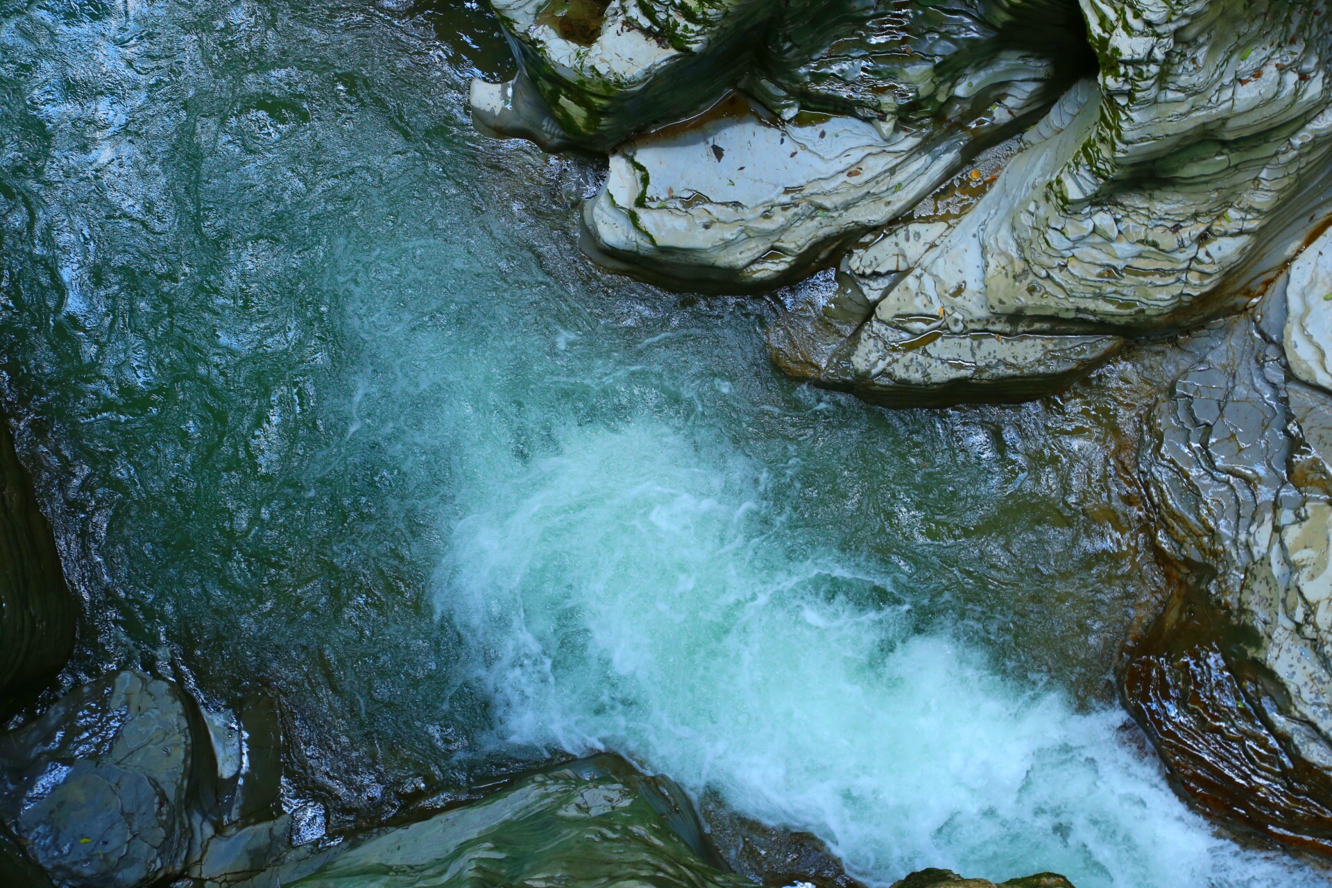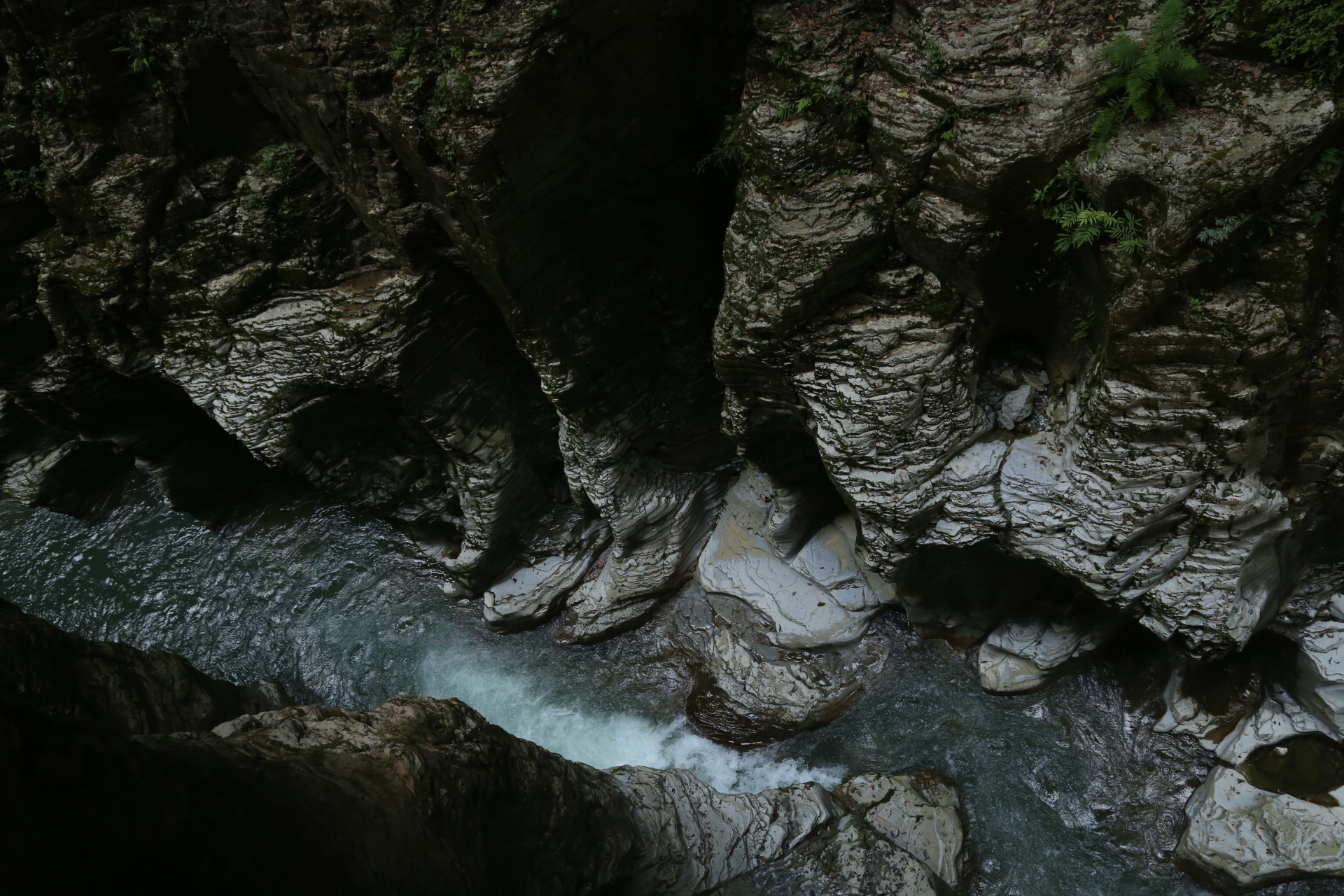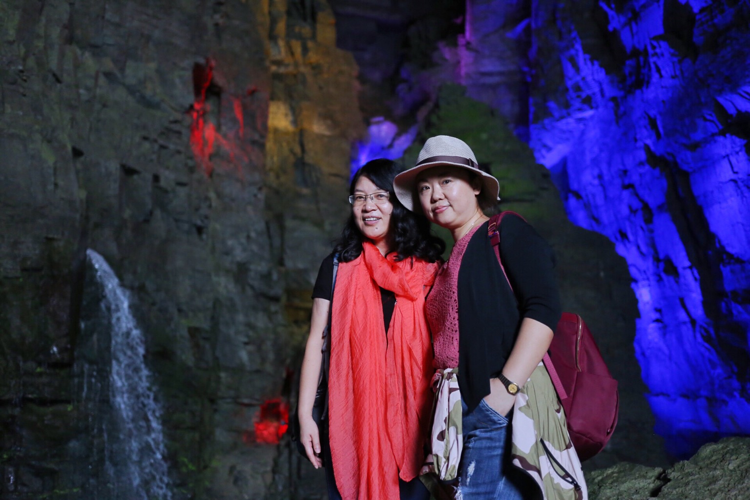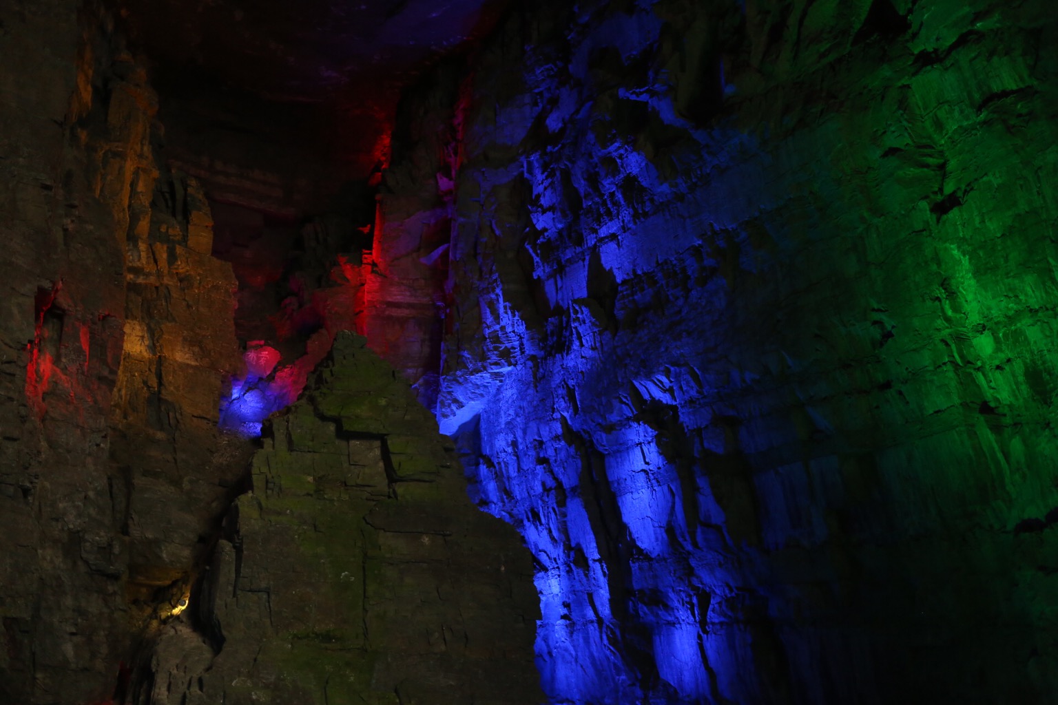 在地缝中行走非常凉爽,偶尔从头顶会落下几滴水珠,阴暗潮湿的岩壁和水拍打岩壁的声音让我们开始体会到了北纬30度这个神奇地带的魅力。