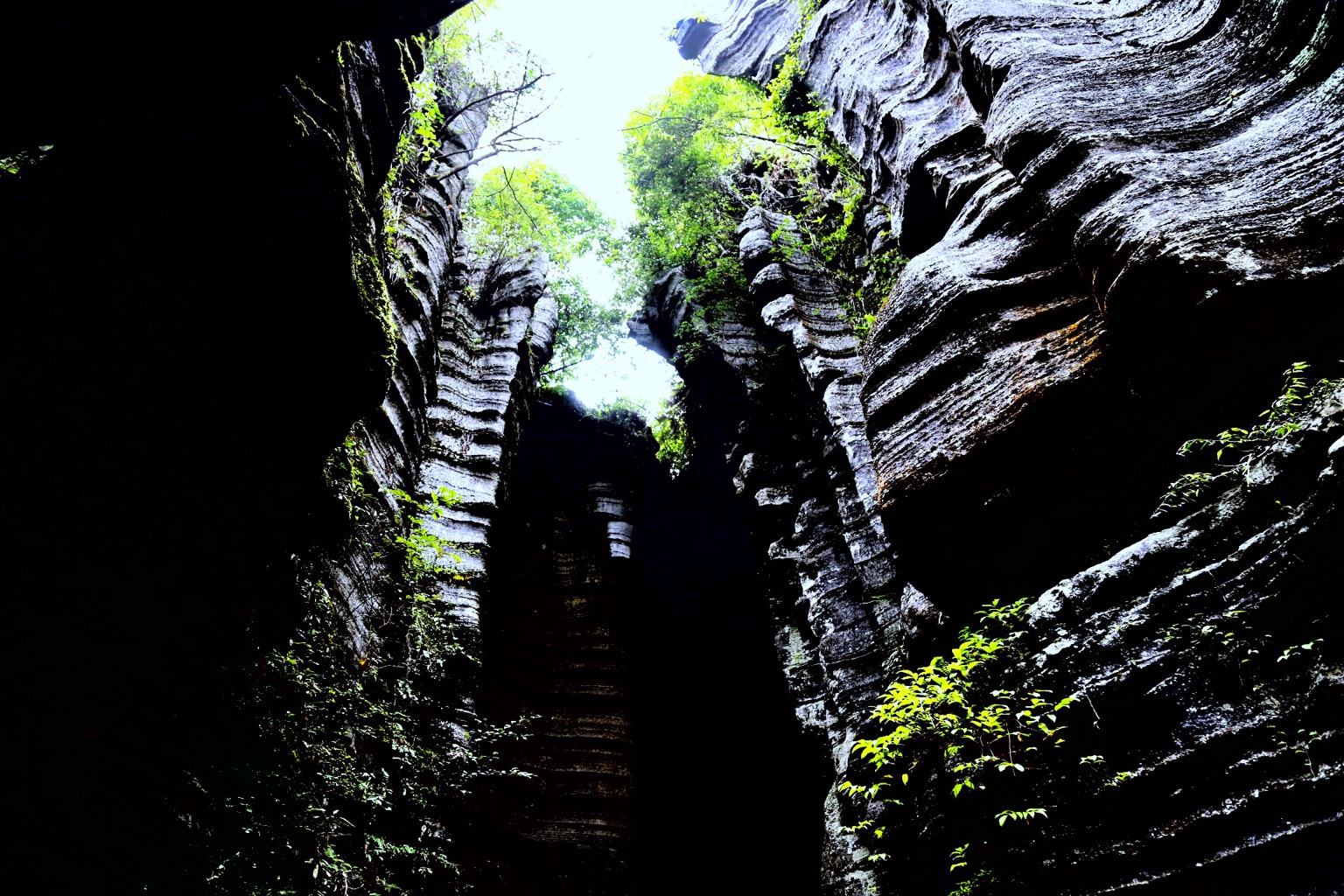 过了峡谷中段,就深入地缝了,如果说刚开始在栈道行走是惊险,那么在地缝行走就是神秘加刺激了。