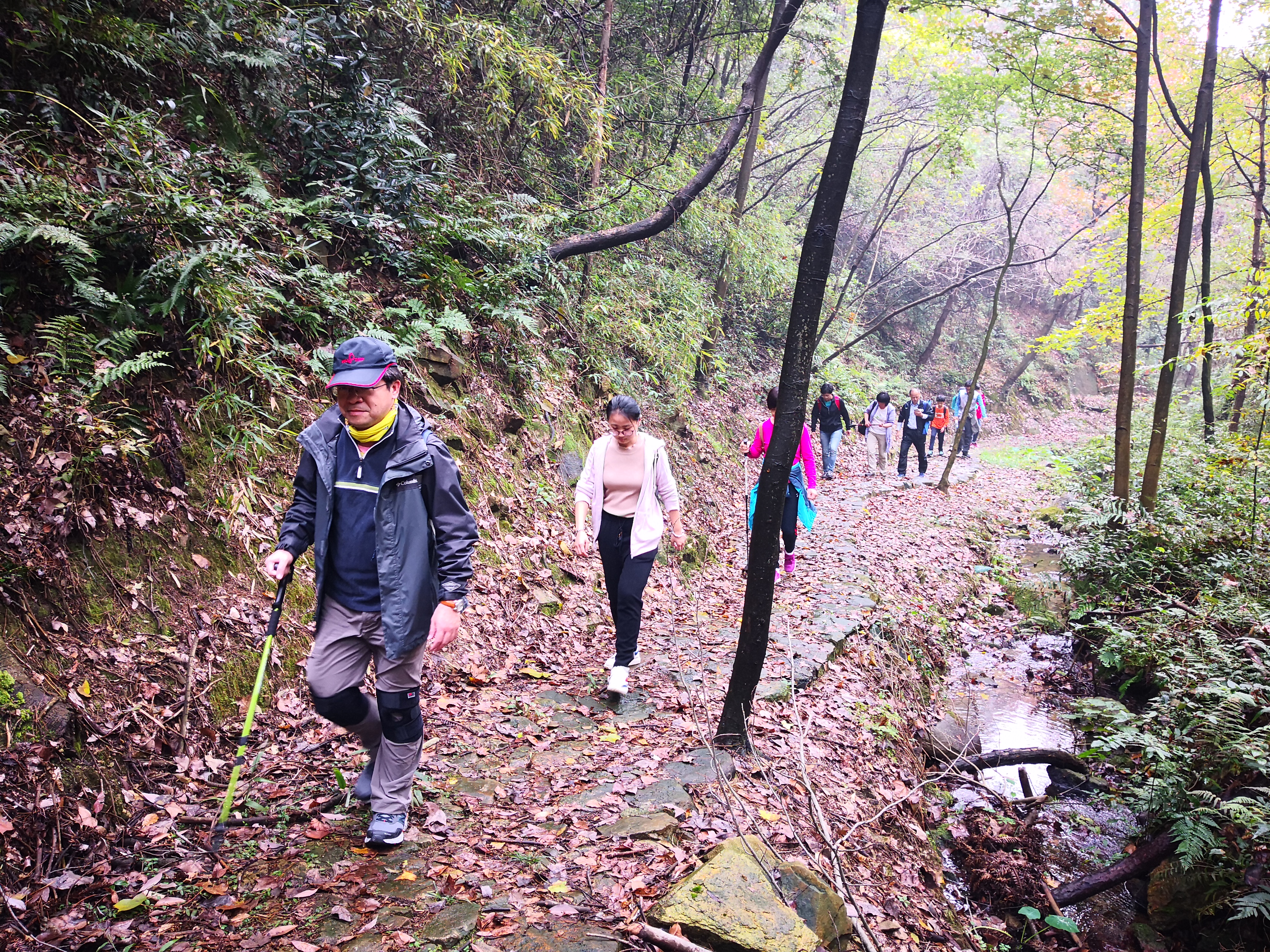 行程简介:大雾尖位于绍兴市柯桥区福全镇容山村,该处是被“绍兴会稽山森林健身游步道”圈入的30条游步道之一。在当地有“吓死人的香炉峰、走死人的大雾尖”之说。我们驱车转入山脚下的容山村,将车停在容山村村委门口的空地上,大家下车热身以后开始徒步。我们穿过村庄、走过一大片田地,沿途野花野果作伴,让人无法心无旁骛,在经过山脚下的扑落虎水库后,开始真正的登山。沿着蜿蜒山路,一路上绿树成荫,红叶满地,伴着淙淙山溪,经过云泉禅寺和万缘亭,方踏上直达山顶的台阶。与别处步道有所不同的是,大雾尖这一段绵延的上山台阶,恐怕会让人患上“台阶恐惧症”,从底下往上望,一眼望不到台阶的尽头,一步叠一步的台阶向上无尽蔓延,似乎毫无停歇处。唯一克服的办法,只有埋头迈腿。有心人在地上写了台阶数,200级、500级、850级……近山顶时,一座红亭供人歇脚,一副对联颇有趣味,“登高峰求神明脚脚上升,上名山拜佛祖步步登高”,这恐怕也是鼓励腿酸者继续登顶的一种方式了。继续拾级而上,周围的山景也慢慢转换,不久,一处禅院现于眼前,这就是山顶的香山寺。寺内设有斋堂,全是素斋,有人进去打探了一番,方知来得较晚,饭菜不多,也就作罢。大家,落座参观后,各自歇息,吃些干粮,完成大合影后,从寺院后门下山。此行,我们没见到让大雾尖得名的大雾,只有近处满眼的红叶秋果,及远处茫茫群峰叠翠。下山走的是盘山公路,大家一路缓行,于午时两点到达环线终点,结束行程。(大雾尖环线:容山村—扑落虎水库—半山殿—香山寺—凉亭—丰项村—新迪埠村—幼儿园—容山村)。