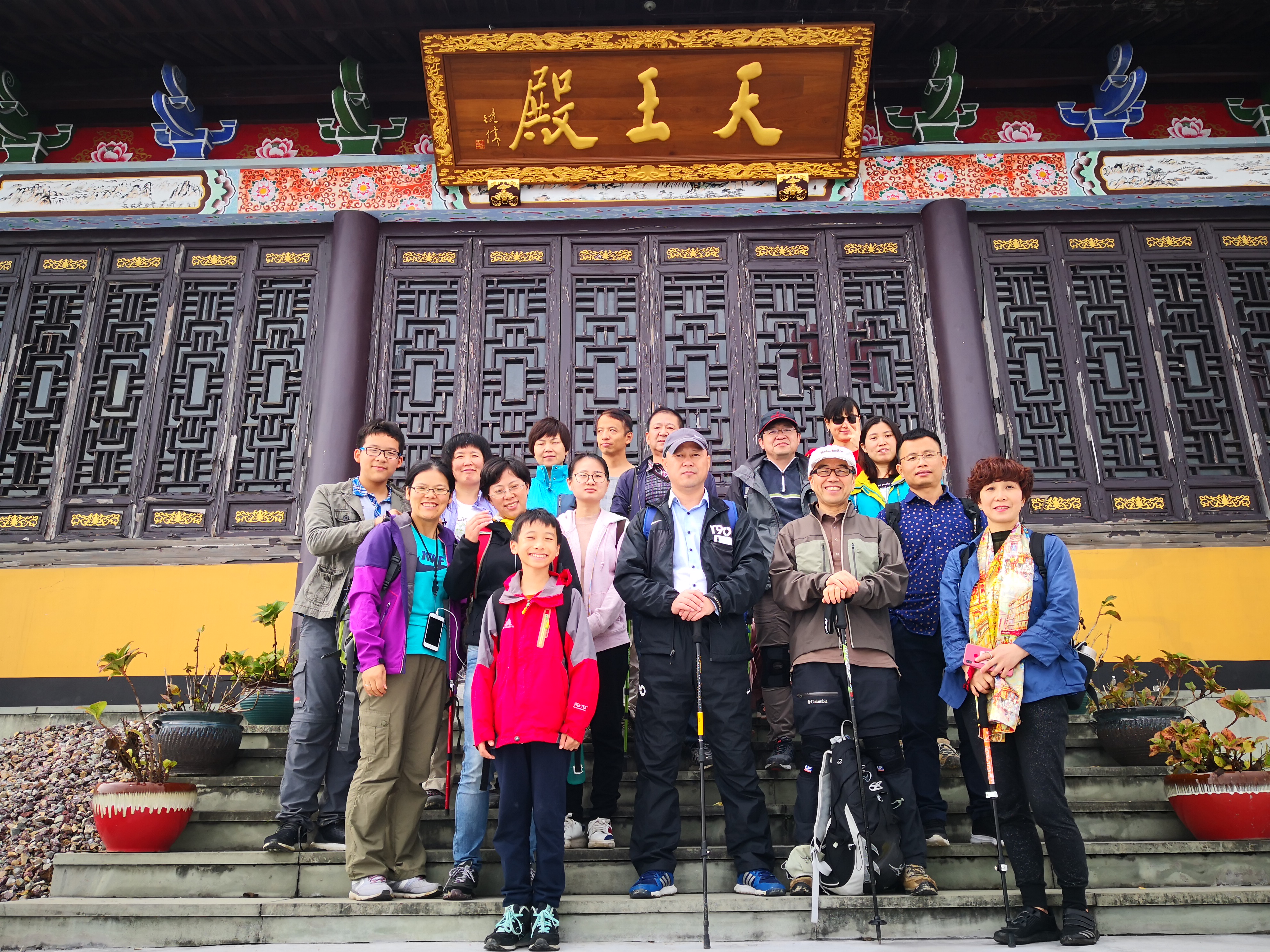 山顶天王殿合影,悲催的是,大雾没见到,却遇到了大风,掏出旗子正欲合影留念,它却随风而去,难道这就是旗与风的缘!