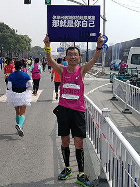 15年开始是在小区附近绕圈走路,还是想跑步但是跑不起来,开始每次只能跑一两百米,当中也放弃过,因为好长时间还是跑不起来。其实从走到跑起来花了9个月的时间,16年8月开始可以跑3公里了,坚持天天跑3公里,当时是想锻炼身体,后来不知道怎么的,越跑越多跑到5公里,5公里不过瘾了开始跑10公里,10公里不过瘾跑了半年就跑了20公里,于是17年第一次参加了上海国际马拉松,跑了5个多小时感觉很爽。后面陆陆续续参加了好几场,跑马拉松就是一群跑者的狂欢,我们这群领队就是约着一起去狂欢的,马上准备去苏州参加马拉松。