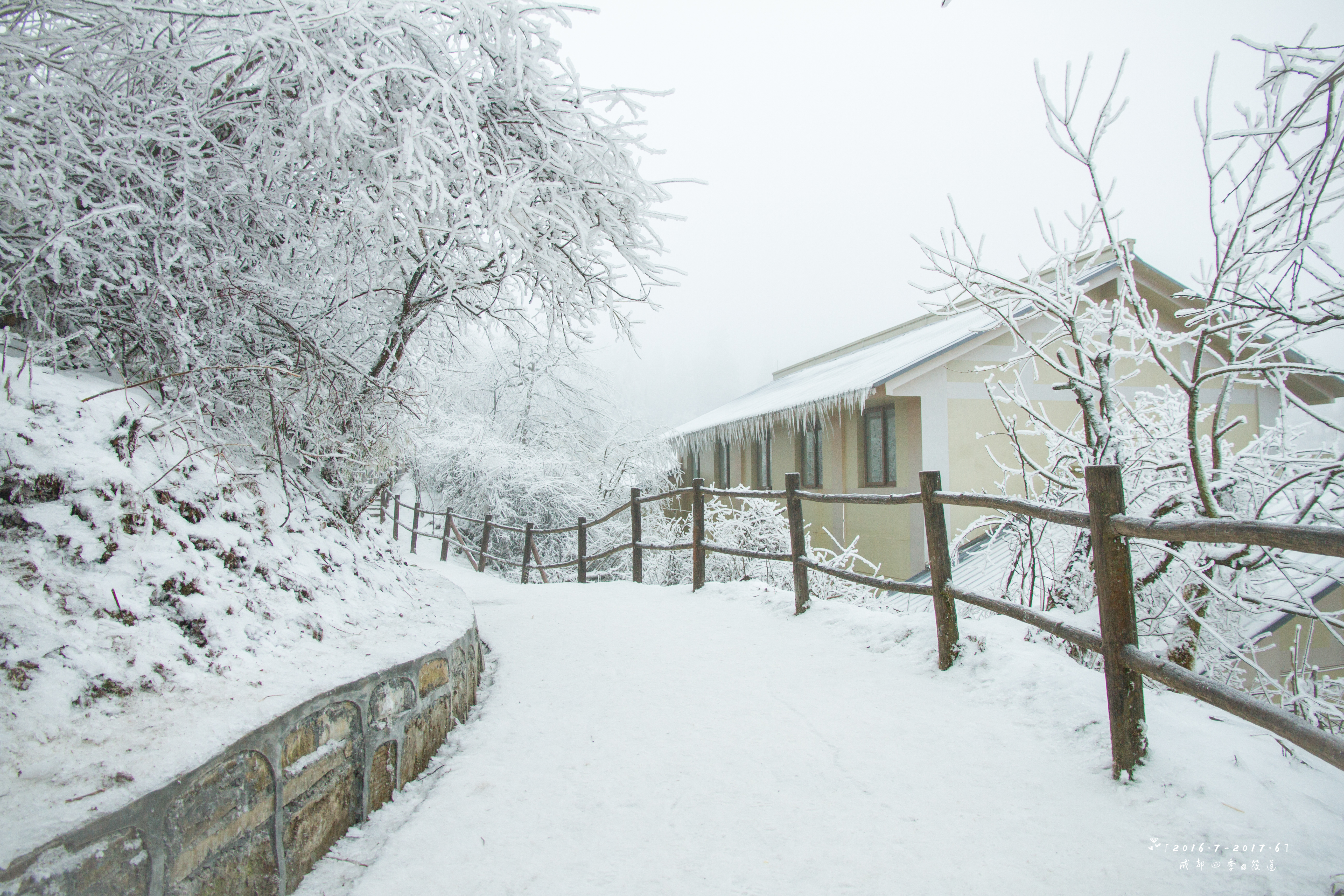 这里与下面完全是两个世界,所有的一切都被白雪覆盖,树枝也早已没有绿叶,厚厚的雪压在树干上已冻成了冰,屋檐上挂着长长的冰柱,此时的画面真的像极了童话世界。