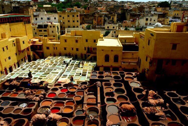 菲斯古城里的皮具手工作坊,尽管气味难闻,我依然不舍得离开,我喜欢这些五颜六色的“调色盘”