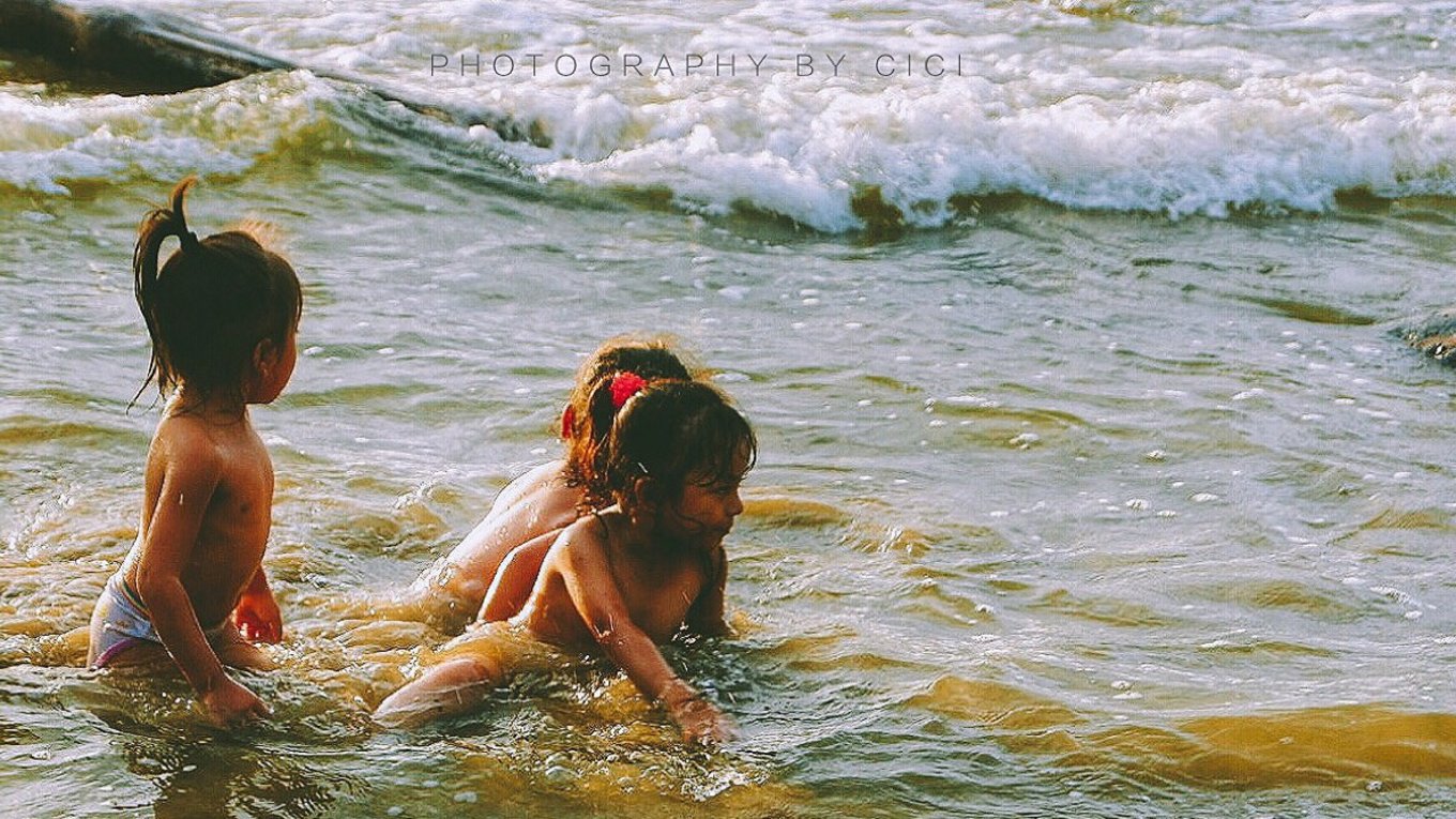 光着身子的孩子在海中尽情玩耍,童真的脸庞洋溢着单纯的笑,愿你们永远像阳光一样灿烂。