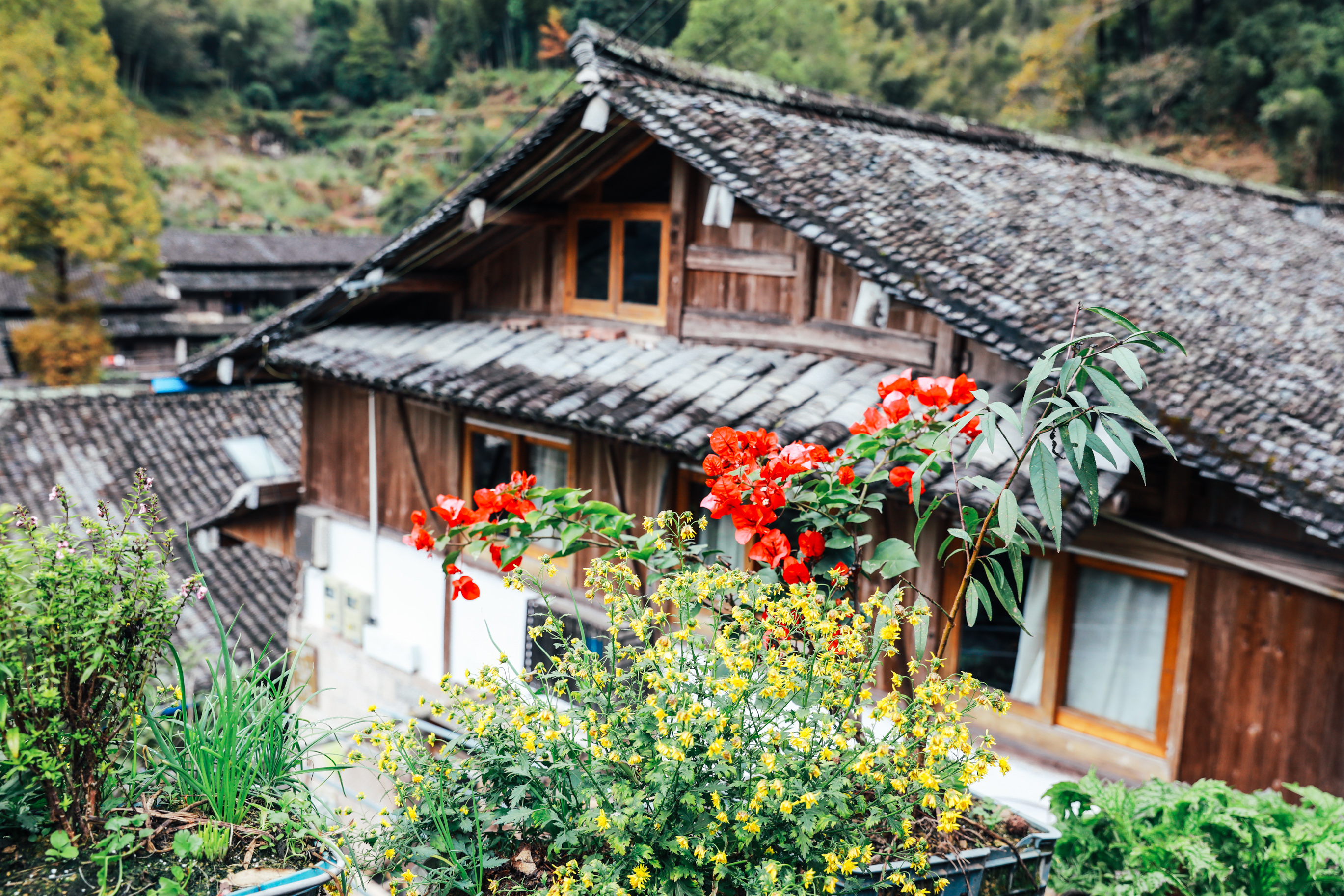 沿着石巷一直走,便能看到积善堂,典型的浙南建筑风格。屋檐上高耸的神兽和门窗上残留的砖雕花纹,都显示出这些古民居建造的年代和曾经的辉煌,阳光照着这些混合各个时代痕迹的古民居,也照着墙头盛开的花朵,仿佛忘却了岁月的流逝......