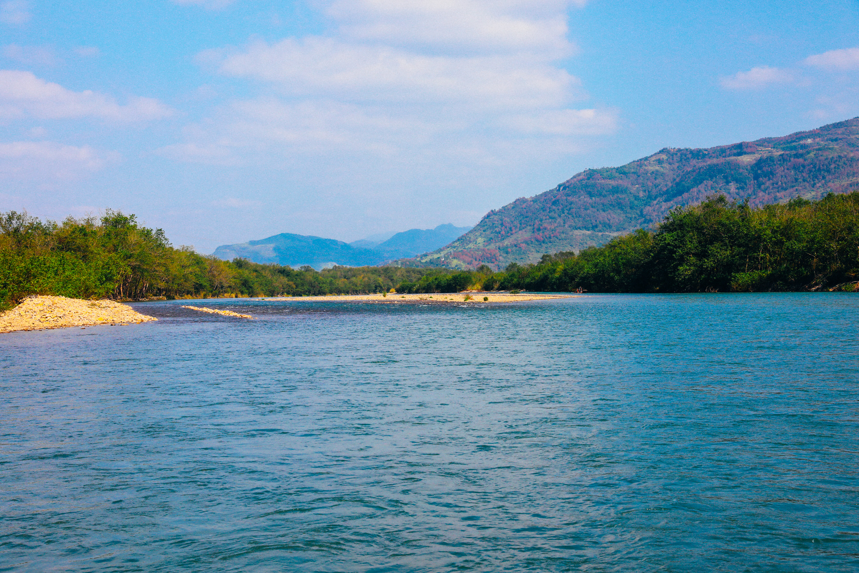 泛舟坐筏漂游江上,远眺绵绵青山,近看郁郁滩林,欣赏碧蓝江水,饱览溪光山色,令人心旷神怡。