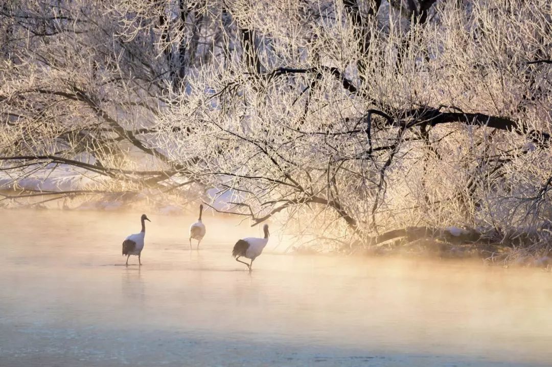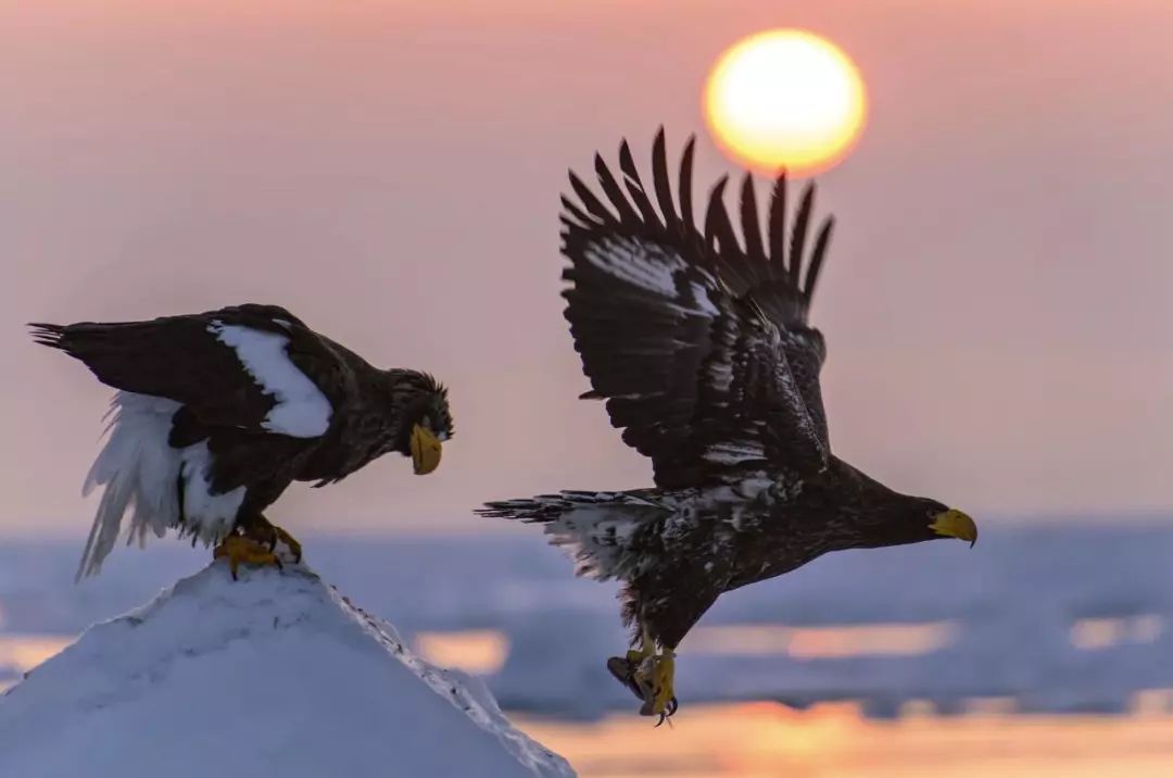 世界珍稀的白尾海雕会在日出时分活动,天鹅也会在温泉中嬉戏,伴着绝美的树冰。