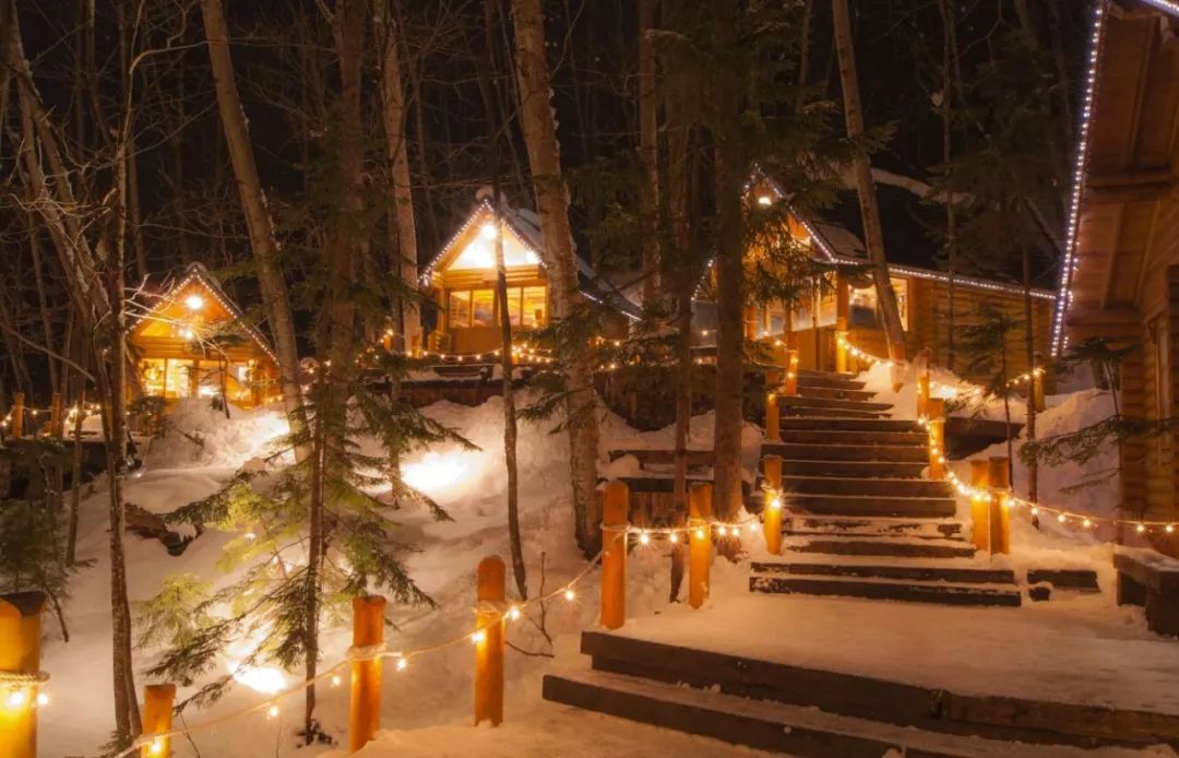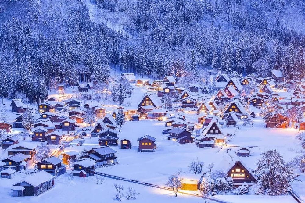 冬夜白雪中的村落透出点点灯火,浪漫无比。
