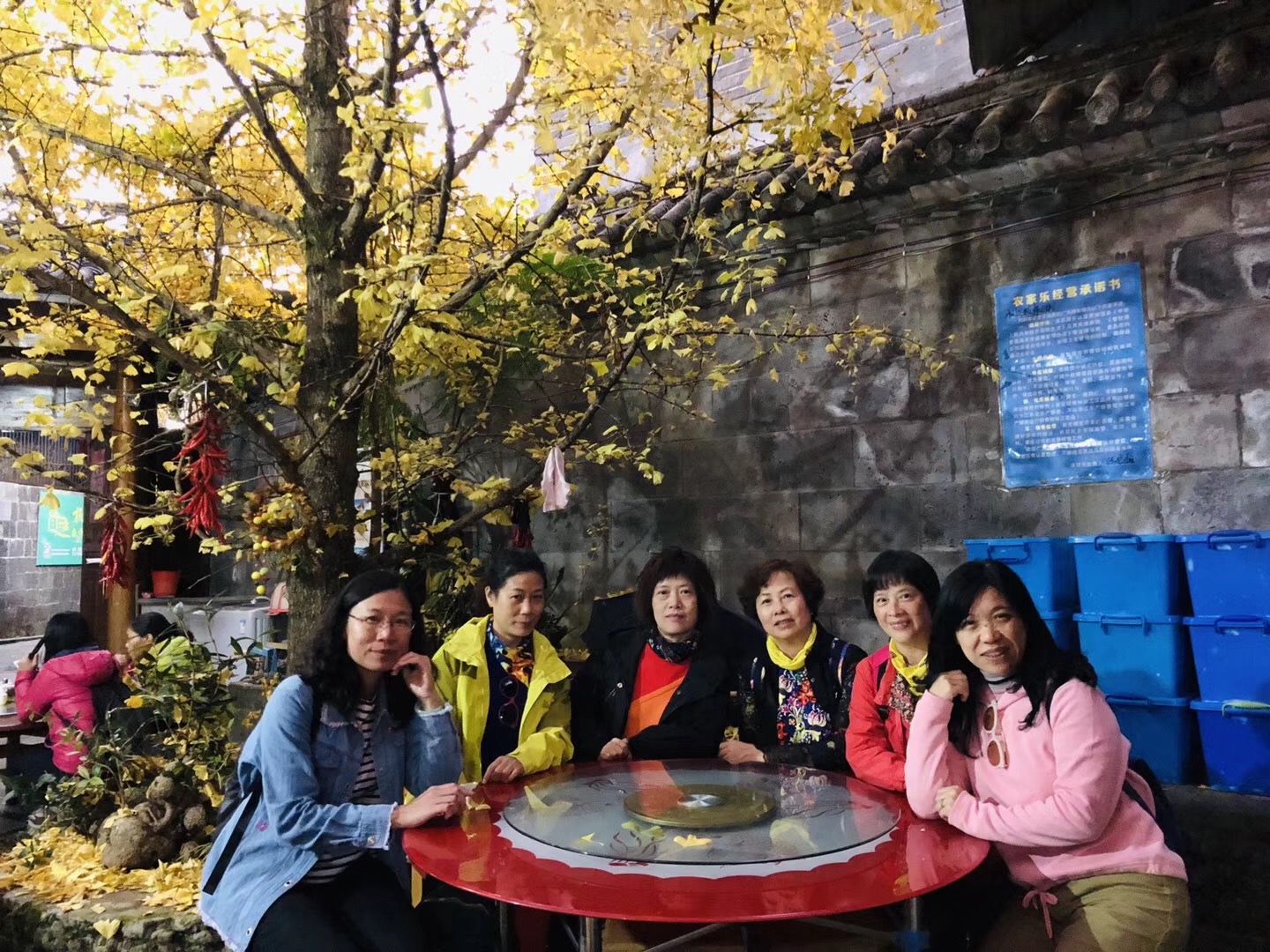 来自广东的六位姐妹们,在银杏树下享用晚餐。