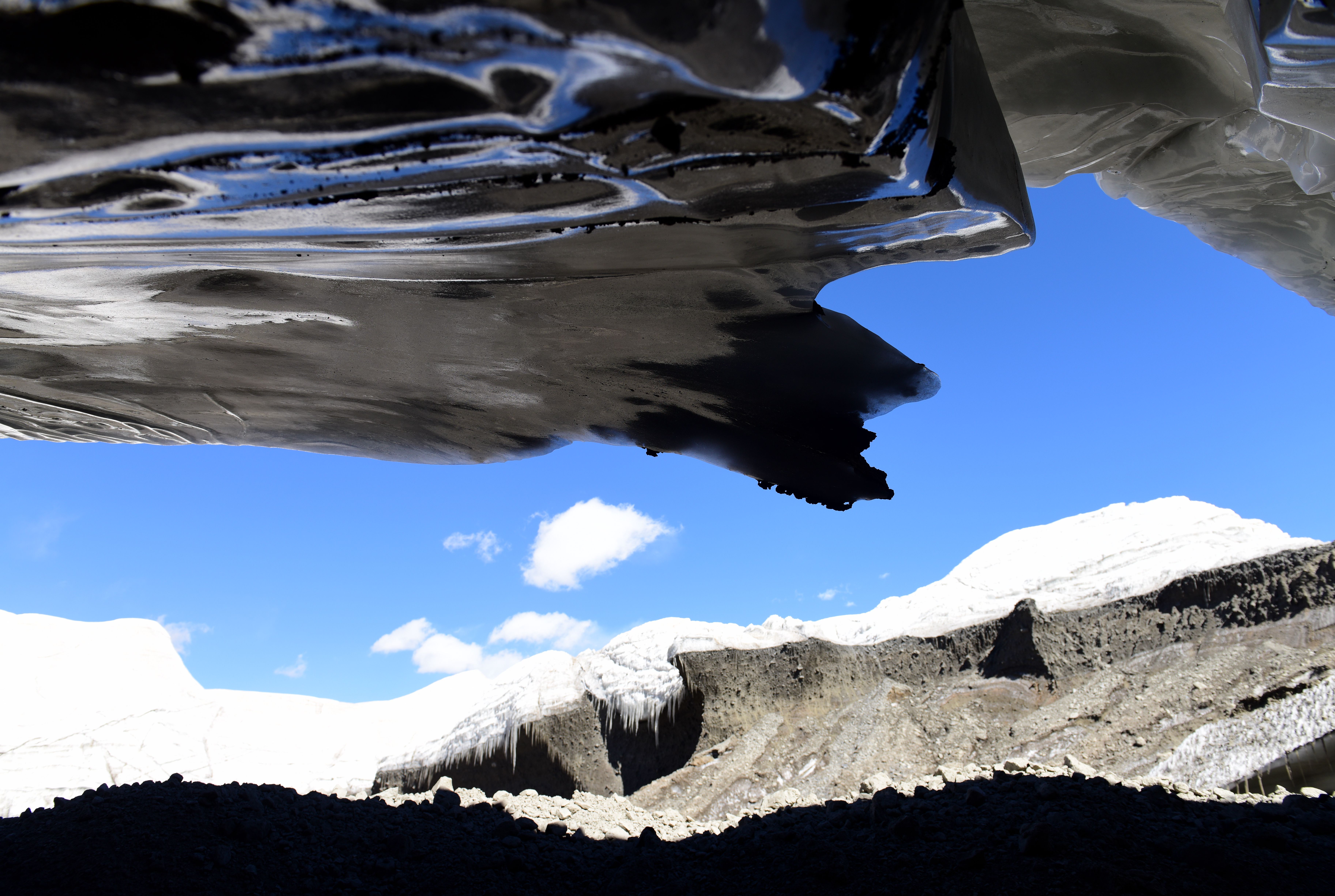 我们继续往上,周围都是冰碛丘陵,石头横旦,我们绕过后往上爬,来到一个洞口。只见一块突出的石崖壁下是一个能容纳5-6人的岩洞,这岩洞不高,靠里边呈30度角斜向一边,岩洞里面是冰壁与冰石,晶莹剔透。冰壁上是一道道深浅不一的纹路图案,像是岁月的年轮,这些纹路图案又像是人工雕琢的线条,很随意、很现代,给人一种苍劲之感。其实,这些纹路图案是夹杂在冰川中间的泥土、砂石组合而成的,它们见证着冰川演变的过程。伸手去摸了摸,硬硬的、冰凉冰凉,这就是冰川,是冰而不是雪。