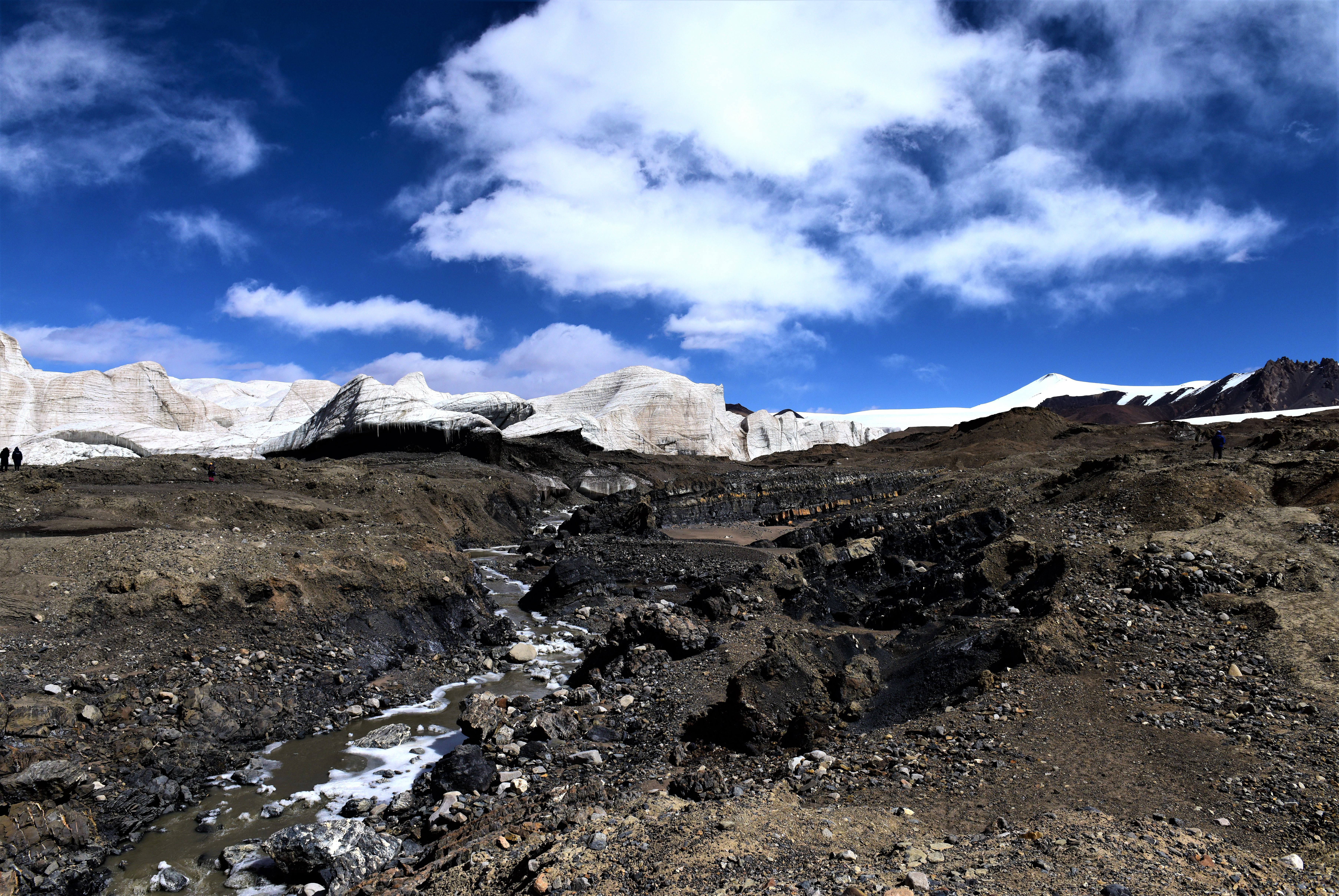 也许是经过了一整个夏天也许是全球气候变暖等因素,给人感觉冰川在快速消融,地面到处是不大不小的勾壑中流淌着融化的冰水。