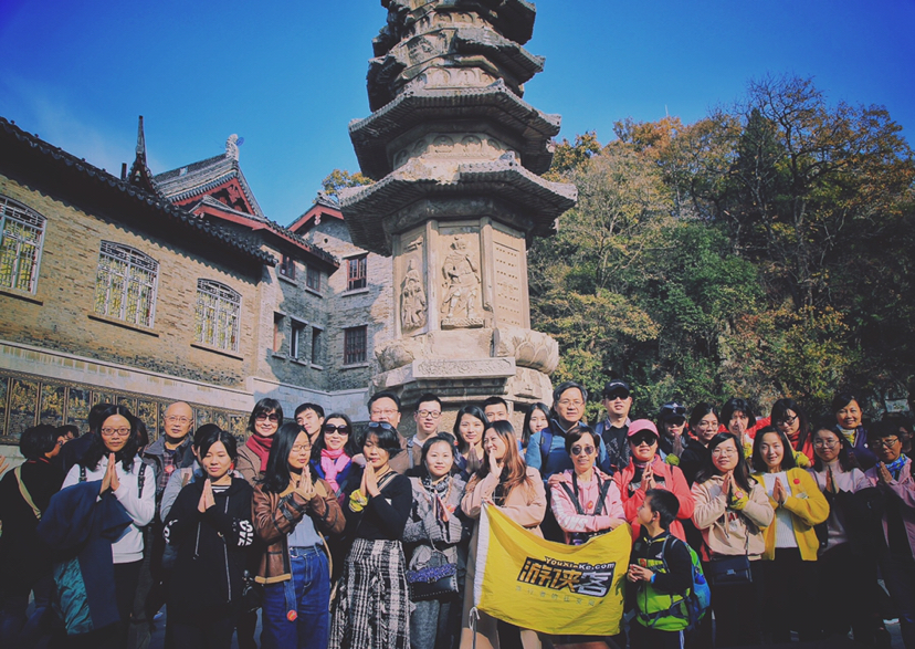 往栖霞寺里面走,是隋朝建造的舍利塔,舍利塔背后是千佛岩,南宋时候的石刻,到现在还能看到历史的遗迹。在舍利塔前拍完大合照,我们就从这里上山了,全程徒步上栖霞寺后山赏黄叶红枫。