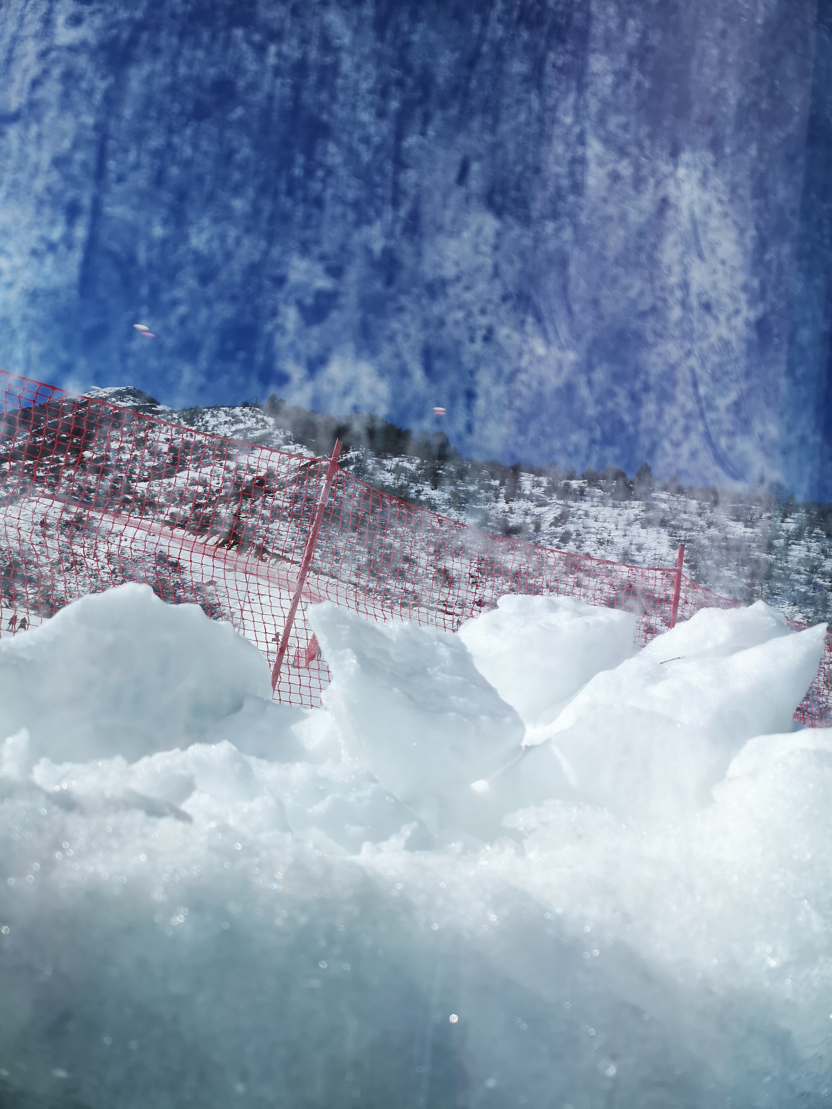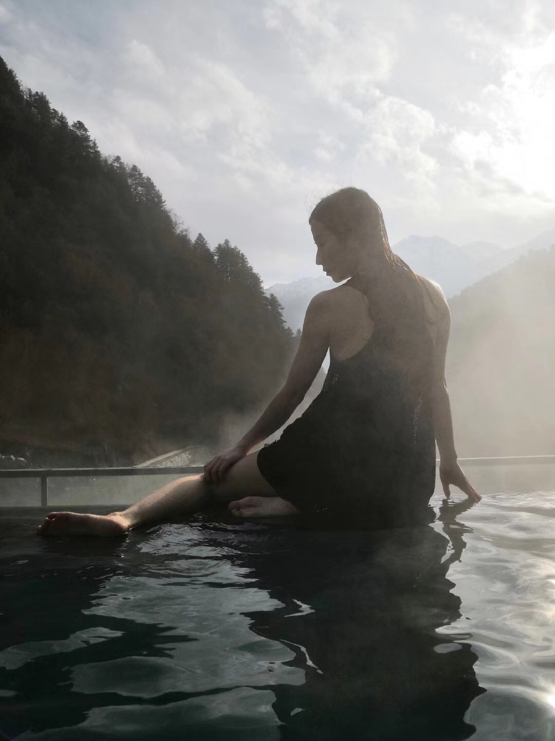 温暖的泉水与远处的雪山相辉映,展现了不一样的世界