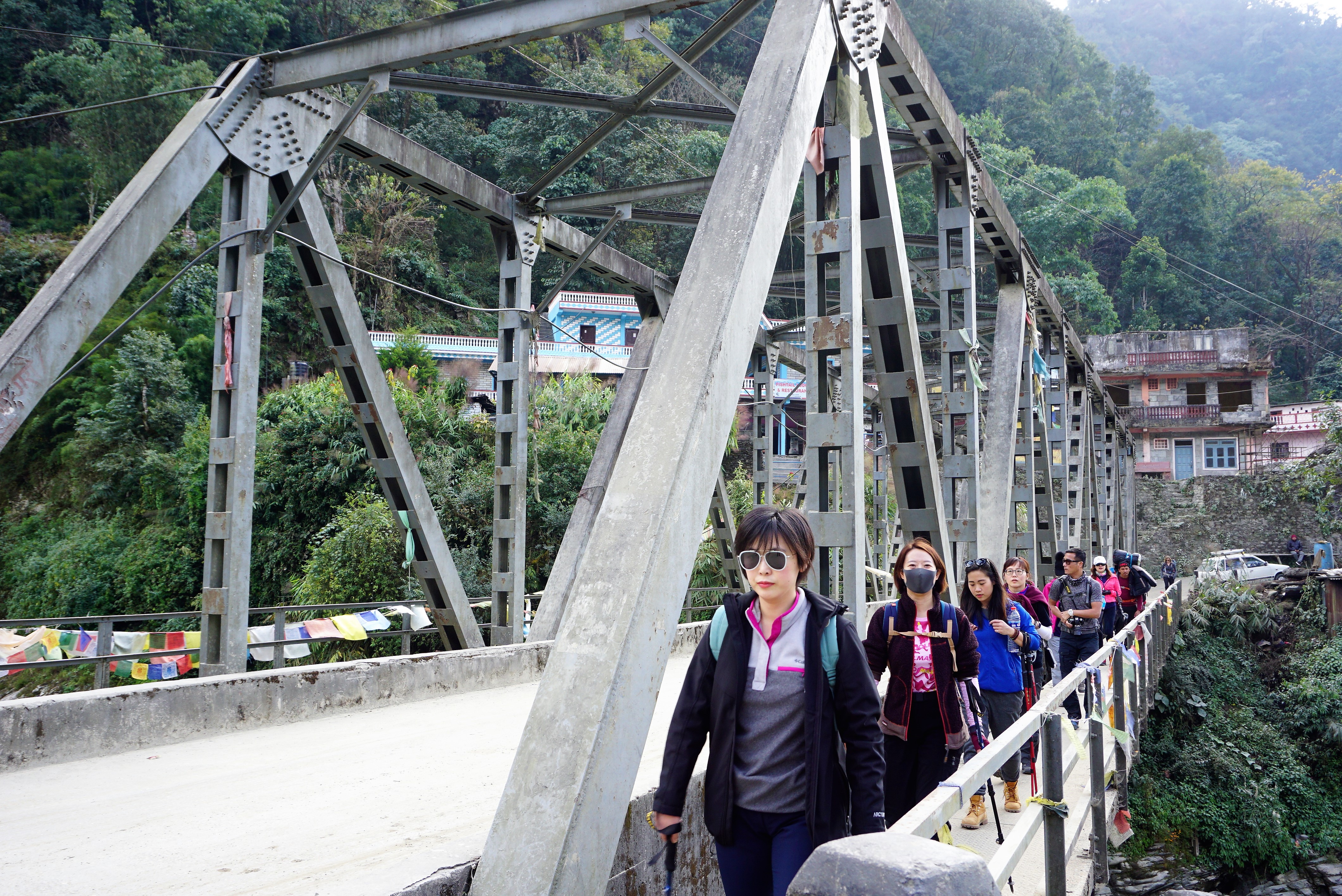 其实我们从博卡拉开到山里,一直都是沿着河边走的,所以一路上可以看到很多这种横跨两岸的铁索桥,而这一座是我一路上看到最长的。