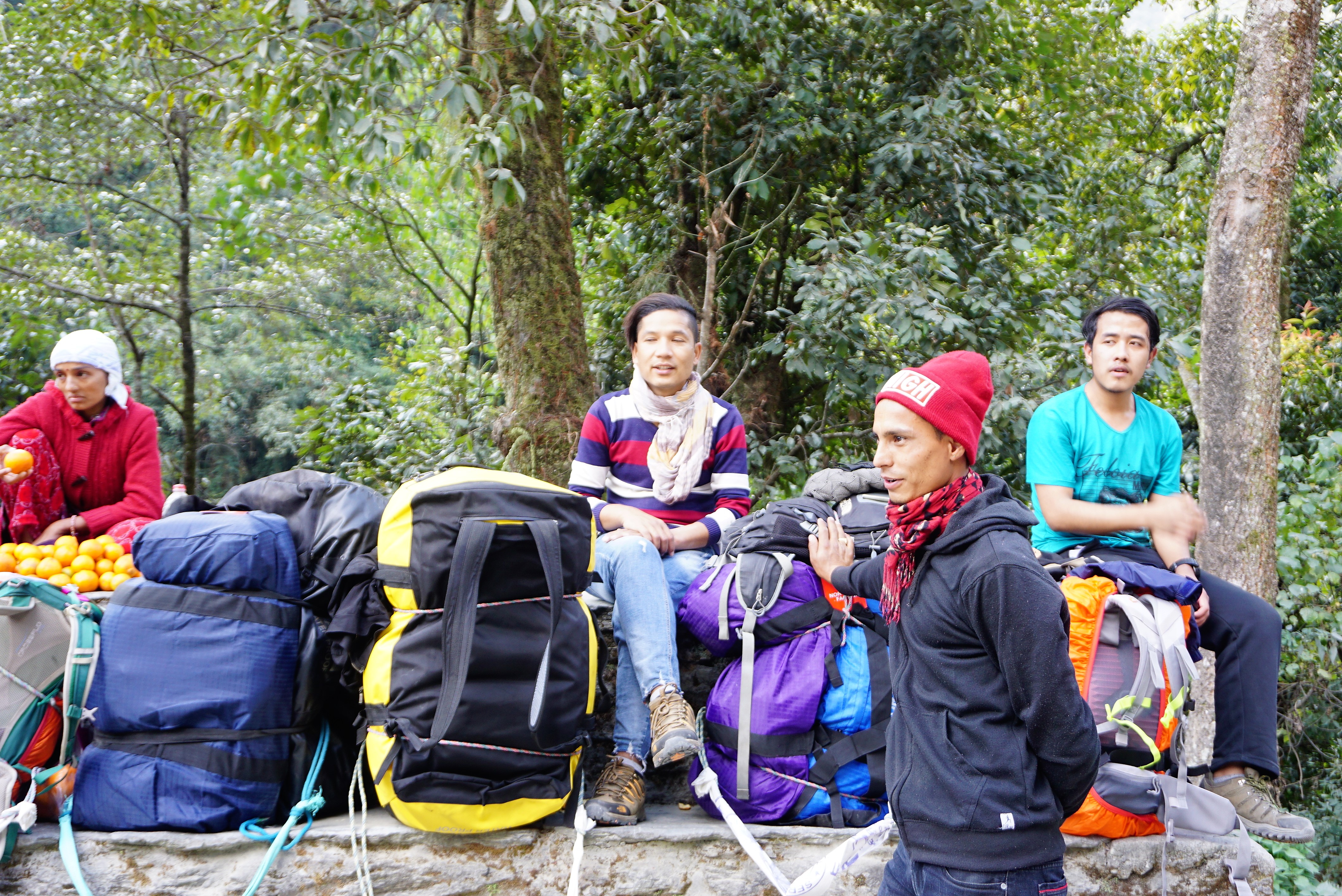 尼泊尔的背夫都是靠头部借力,如果行李不是太重,正常背就好了,累了就卸下行李,坐在路边休息一下,我们这些徒步者也能喝喝水,歇一歇。