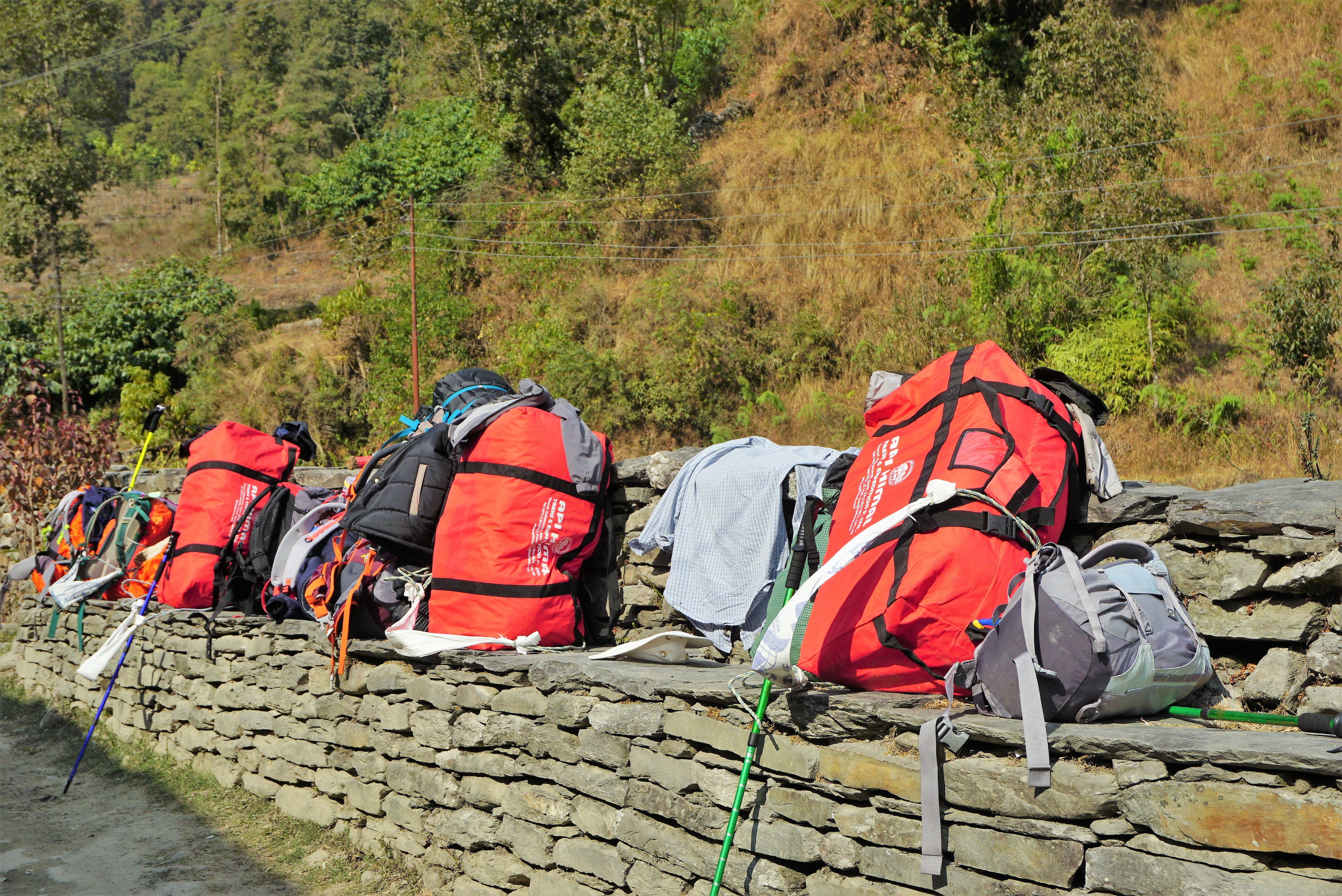 徒步尽量轻装,一个大的登山包,我自己带的是40升,感觉刚刚好,自己再随身背一个小包,装水,干粮,增减的衣服等。大的包给背夫背,小包自己背。其实背夫都挺辛苦的,一个人负责两个徒步者的大包,所以也不敢在包里装太多东西。为了减轻负担,建议大家带羽绒睡袋而不是棉睡袋。山上房间没有暖气,但被子挺厚的,所以加上薄羽绒睡袋其实是足够了。怕冷的话,可以把羽绒服塞到睡袋里一起盖着,再不行,请你带上暖宝宝,直接往身上贴。在山顶的那一晚,我就贴了两片在脚底。保温杯也是必备物品之一,沿途的Guest House都有姜茶卖,80-100尼币一杯,可以直接倒进保温杯路上喝,喝完整个身体都能暖起来。