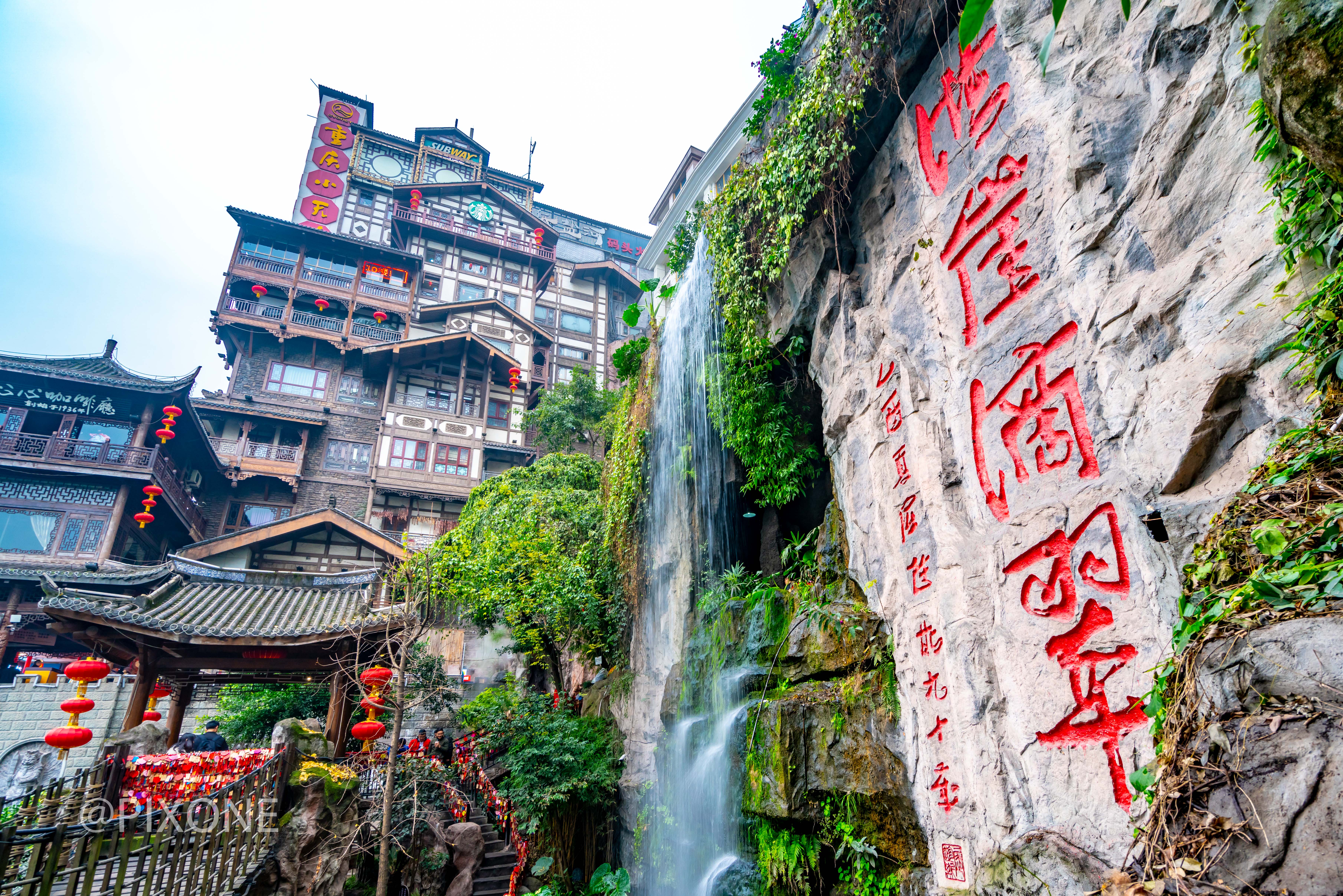洪崖洞,旁边就是千厮门大桥,桥下面是轻轨,上面是汽车,往东步行10分钟以内就到解放碑。