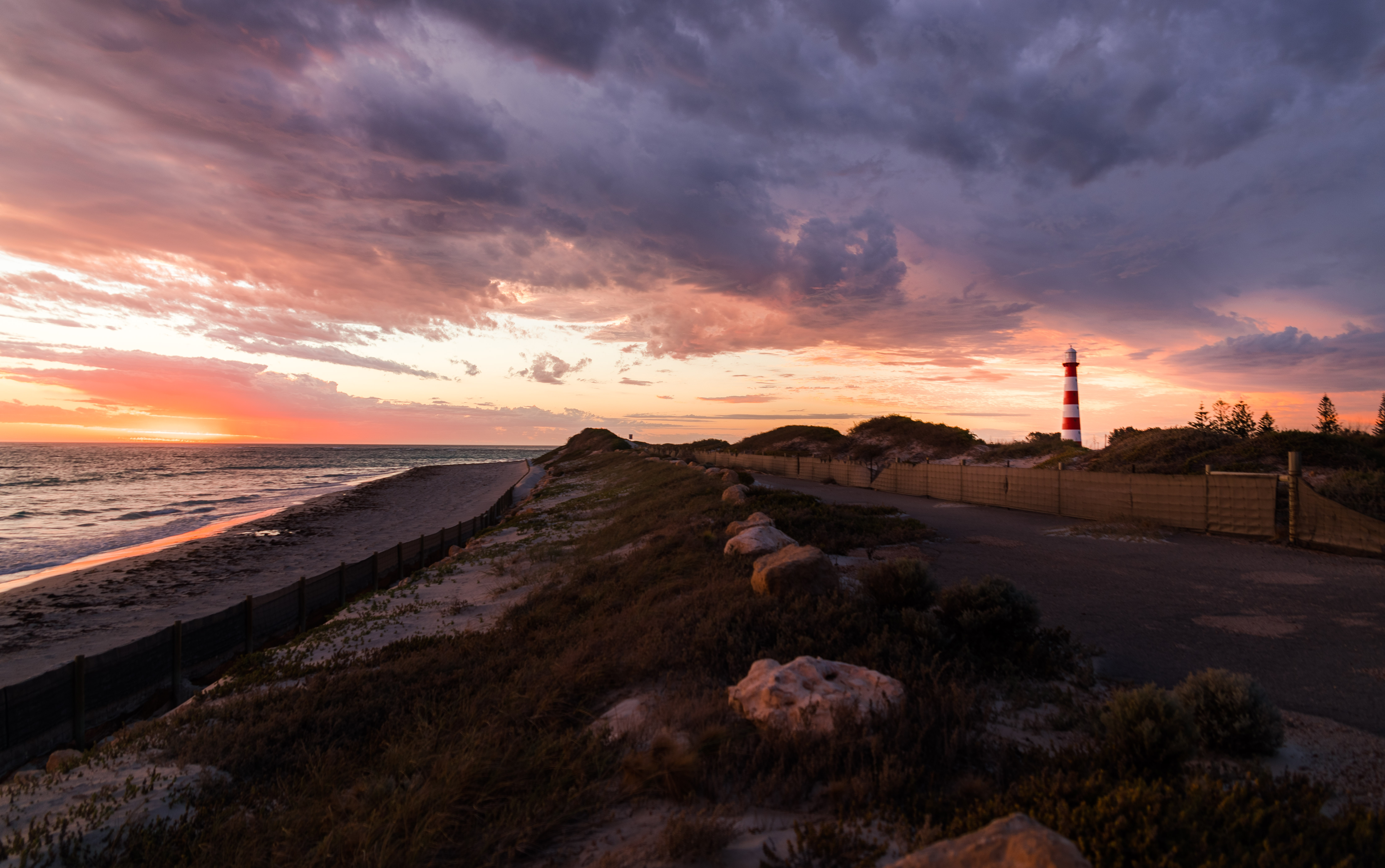 由于地处澳洲大陆西端,西澳的夕阳比日出的美感高出太多,每一个晴朗的天气在海边看一场日落,不管在哪里都是一件非常值得等待的盛大谢幕,比起日落刚开始的鲜艳橙红色,我更喜欢太阳下山后几分钟内的那种淡紫色的天空,淡橙色的余晖,和淡粉色的火烧云。