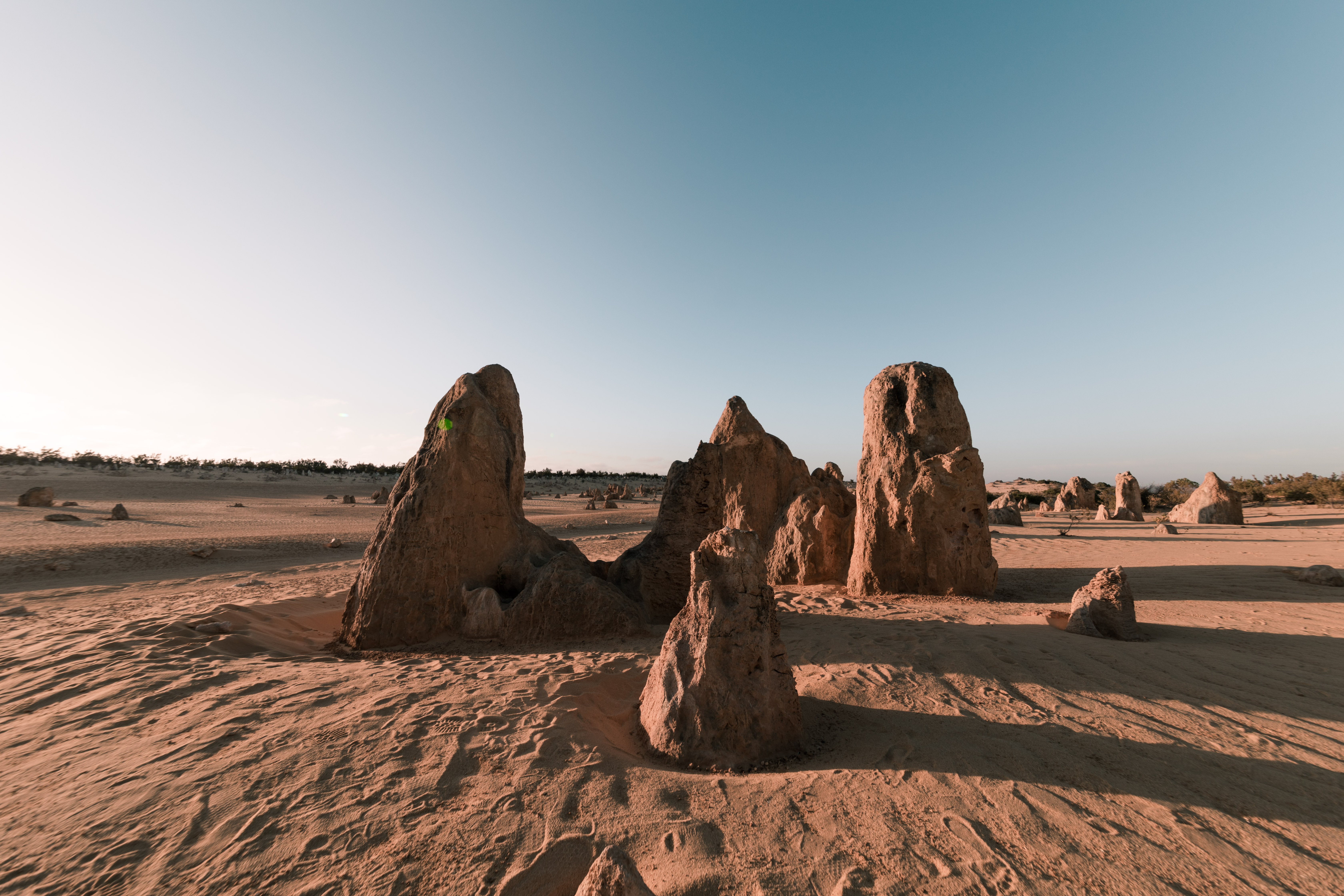 尖峰石阵是西澳的色彩搭配奇才,白色的沙丘和黄色的沙漠石阵还有零星遍布的灌木绿植在这里共存。他也是一位顶级化妆师,裸色偏白的粉底,配上黄棕色的阴影,大地色的眼影,有一些叛逆的墨绿色眼影,刹眼间看上去平淡,但是细细揣摩总能发现各种小惊喜。