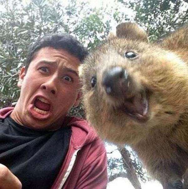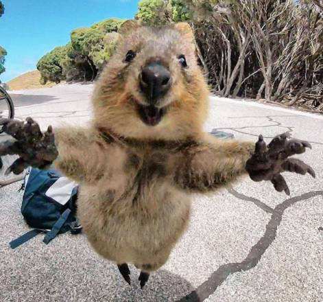 最终小粉丝还是完成了合影梦想哈哈哈,其实从正常的角度(俯视)来看,Quokka长得更像土拨鼠来着并没有想象中那么可爱,但是如果切换一个视角,平视或者仰视的时候,他简直可爱到爆炸。这也是为什么跟Quokka合影基本都需要趴在地上,甚至把屁股撅起来了哈哈。跟Quokka合影的时候最好是从背后小心接近防止惊吓到它,虽然它是一种并不胆小而且充满好奇心的小东西,什么东西凑到他跟前都会上来闻一闻,但是动静太大还是会把它吓跑的。合影的第二个小技巧是最好在他吃东西的时候按下快门,这样的话就有可能拍摄到它正好张开嘴巴的角度。