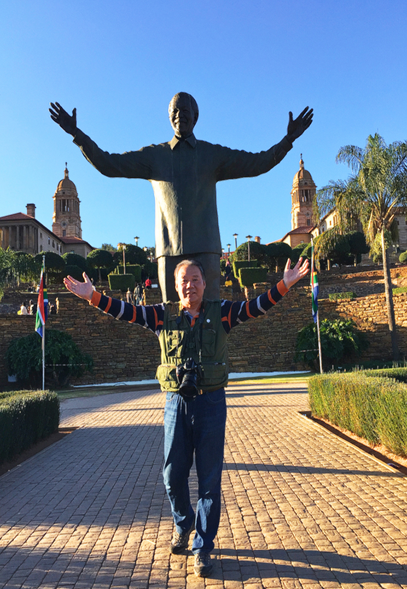 总统府对面,我们看见台阶下面有一座巨人雕塑,加快脚步走过去,草坪上9米高的是曼德拉雕像!无比高大的曼德拉面带微笑,张开双臂向前迈步,像是热情欢迎来访的世界各地朋友。