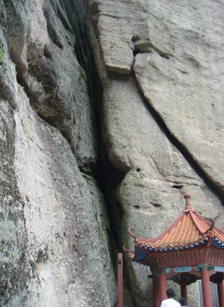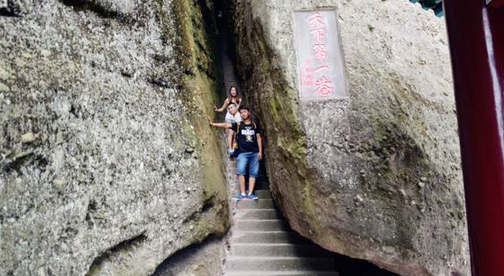 一线天是天一巷景区的特色,也是整个崀山的招牌景色。天一巷景区有三条一线天,分别是:宏伟壮观的“天下第一巷”,赏心悦目的“遇仙巷”,艰难的“揽月梯”。其中“天下第一巷长240米,最窄处仅0.33米。台阶湿滑,一路向上,幽暗清冷,展示了大自然的鬼斧神工。因为太窄,故巷内只可单向攀登,不可交会而行,如果出现交会,那一定是有碍观瞻、有碍市容、有伤大雅、令人尴尬的交会---你懂得。好在这样的情况不会出现。山顶处的“揽月梯”虽然没有“天下第一巷”壮观,更没有那么悠长,甚至称它为一线天都有点牵强,但是它的最窄处必须侧身才能通过,可以想象出一个胖游客通过时的痛苦与尴尬。