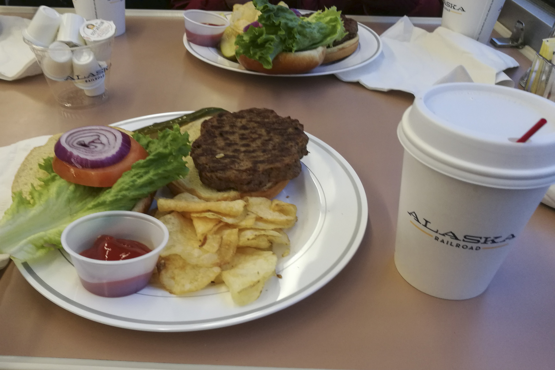 第三天起早,前往安克雷奇火车站,乘坐早8:30开车的极光号列车去费班克斯。极光列车是由阿拉斯加铁路公司承运的一条从安克雷奇到费班克斯的旅游列车,每周往返各一班。此列车行驶速度极慢,早8:30分开车,晚8:30分到达,是纵穿阿拉斯加南北的旅游列车。每当车窗外出现动物或到达某个观景点时,车上会通过广播向大家介绍,然后列车会停几秒钟,让大家拍照(只能隔着玻璃拍)。列车编有餐车和小吃车,分别提供正餐、啤酒和小吃。