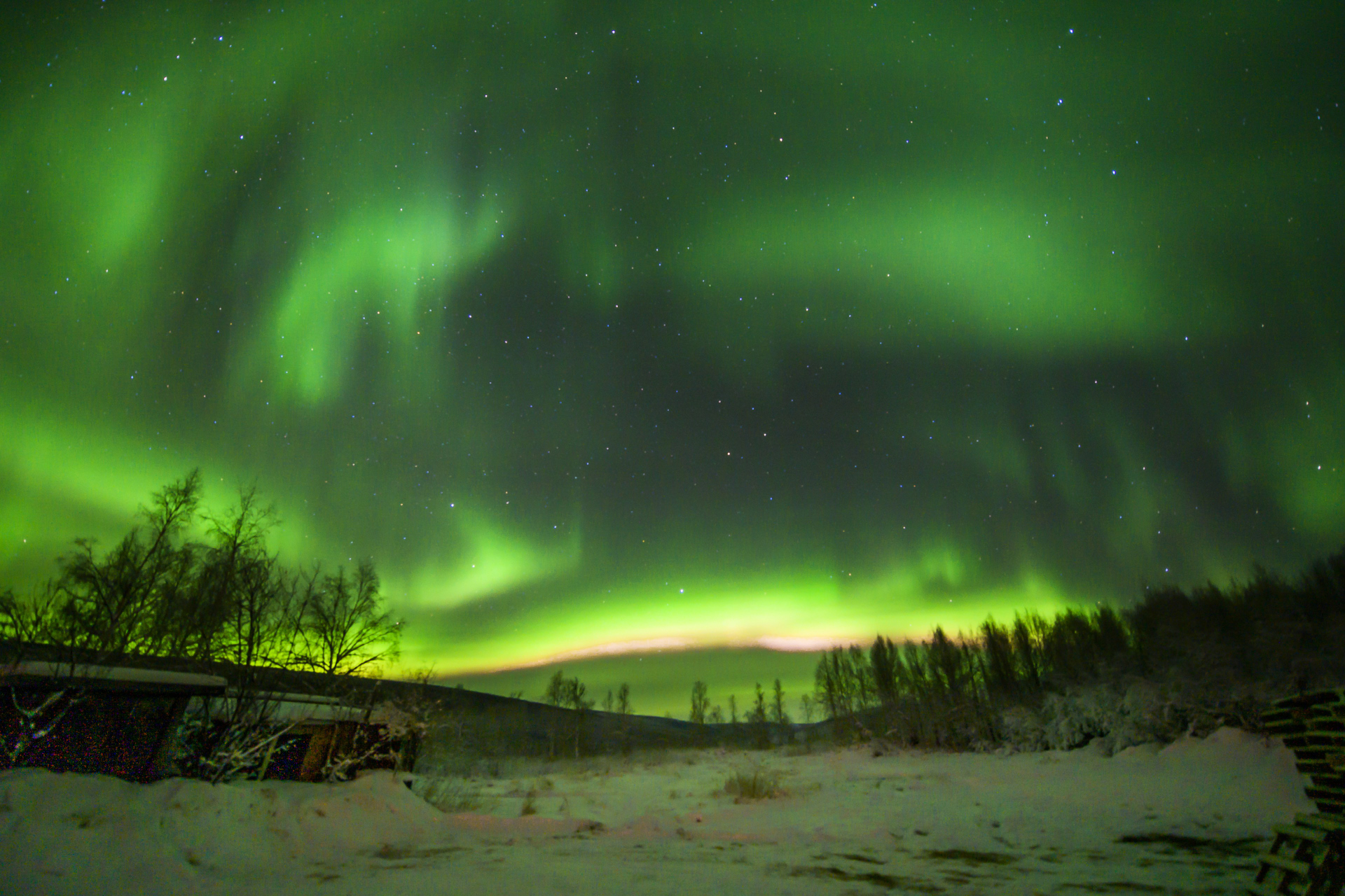 不知不觉,已经到了该返回酒店的时间,很多人已经上车。突然,一波比较强的极光出现,夹带着紫边,在夜空中飞舞,此时,我刚好走出木屋,连忙支好三脚架,拍下一组照片,这波极光只出现10分钟左右。