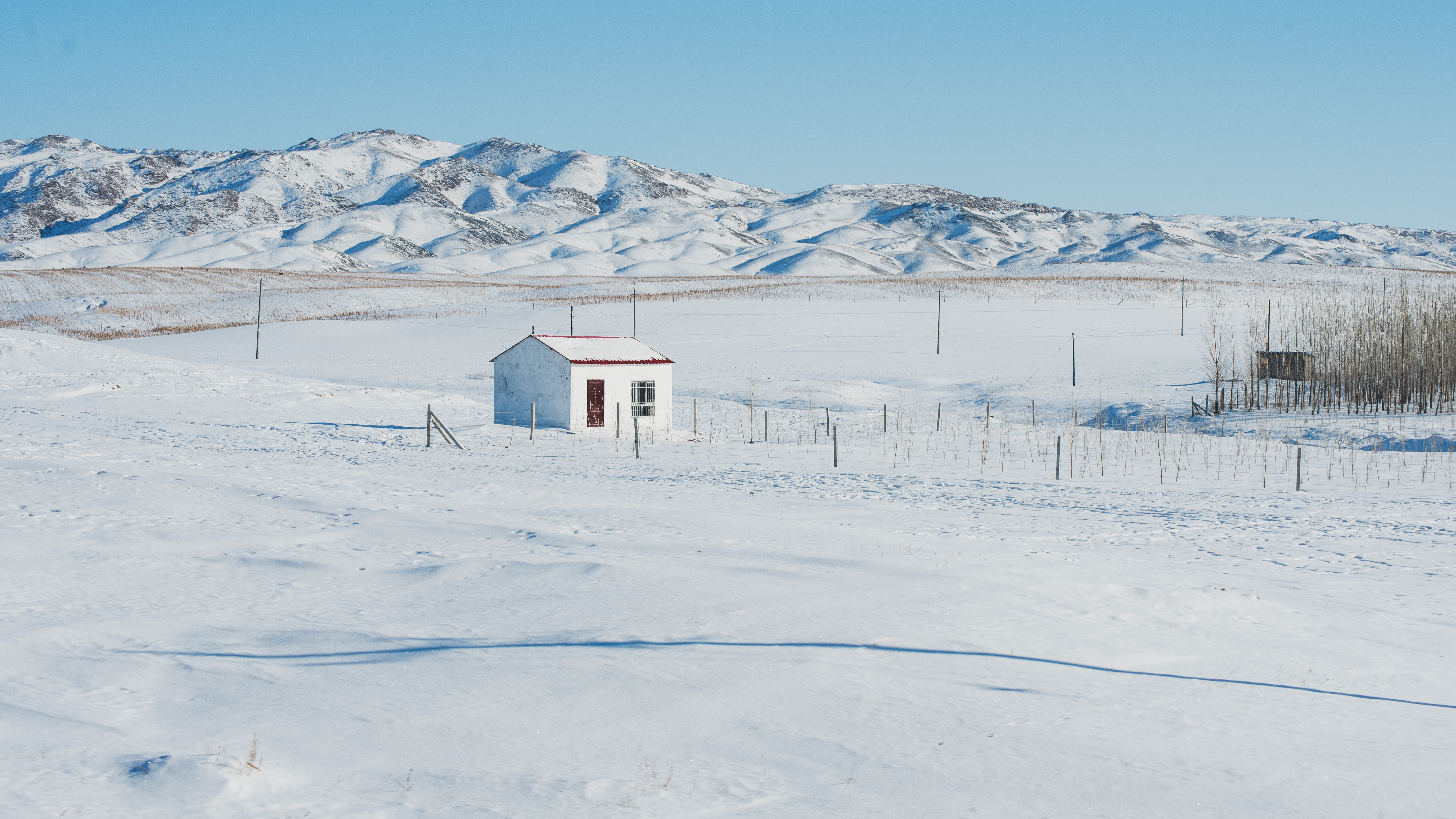 这个季节的 喀纳斯 湖面也完全结冰了。只是远远地拍一张卧龙湾山坡上的小屋。冬天 喀纳斯 的主要看点可不在往日标志性的三湾哦。