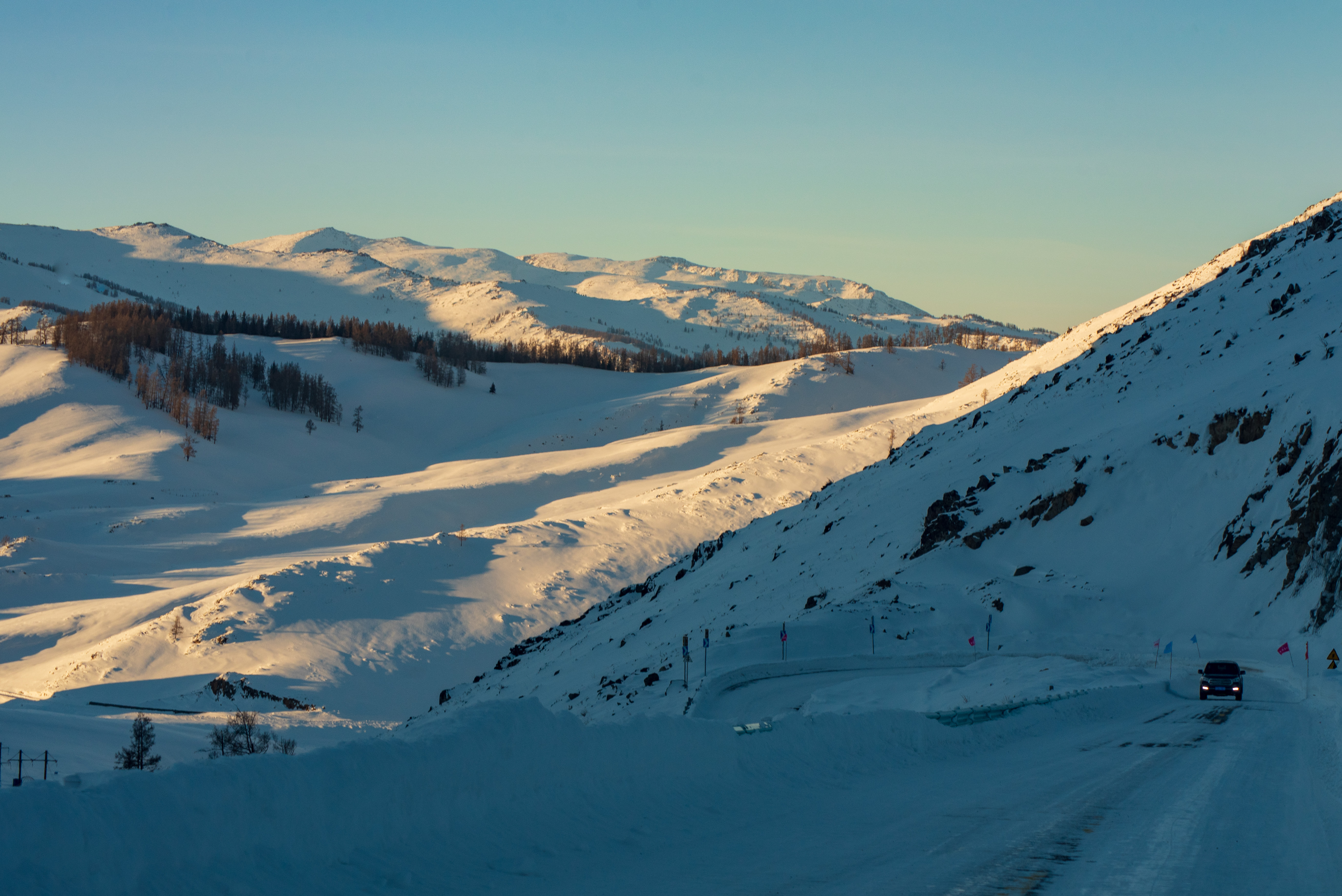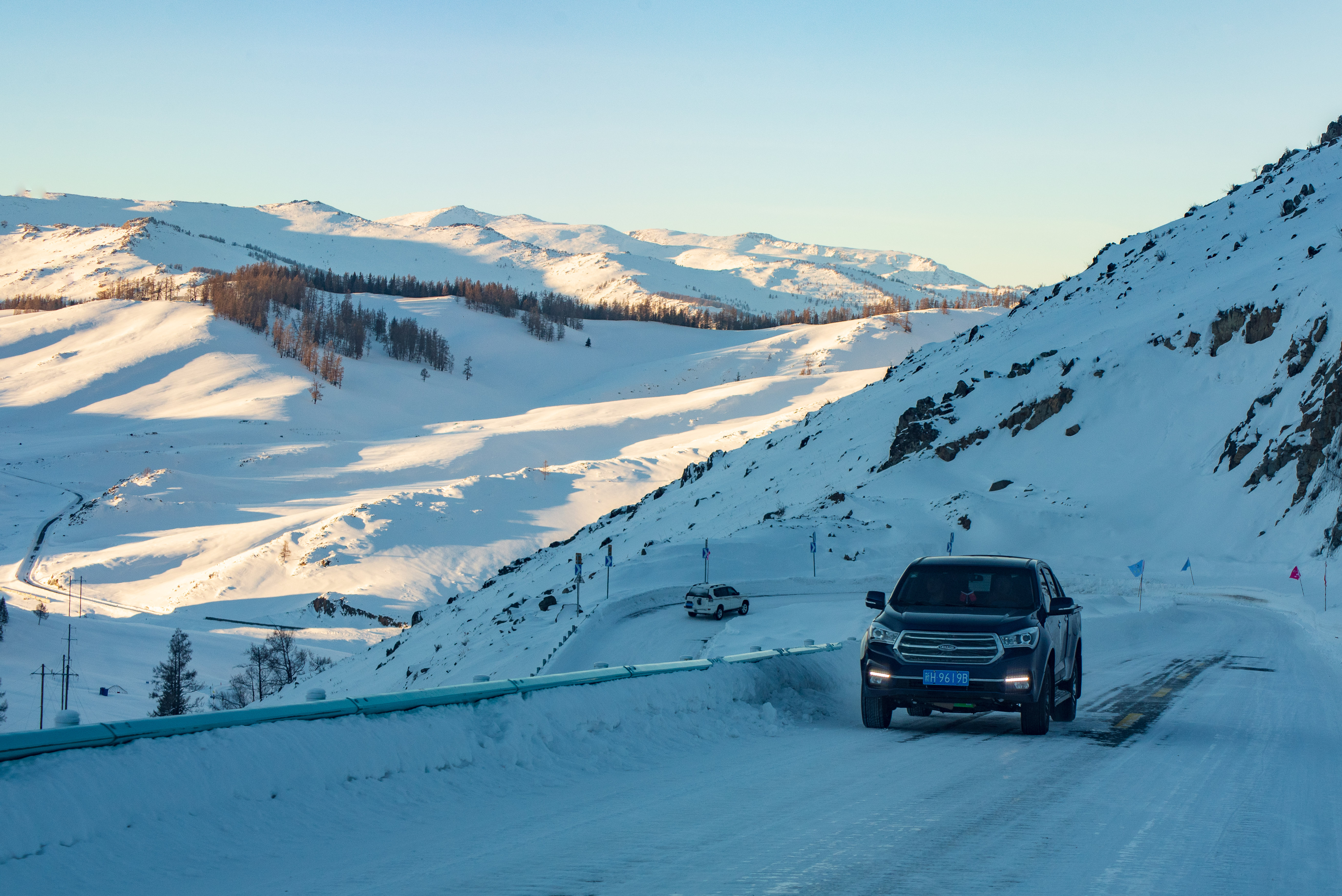 车队在积雪的山区里行驶。此刻我的内心感叹,人类的大自然面前是多么的渺小,而科技的发展又是多么的伟大。要知道早些年,每逢冬季,这里便被大雪封山,和外界的联系就被完全切断了。而如今,我们的车队能轻松地穿越这冰雪覆盖的 阿尔泰 山进入 喀纳斯 ,全凭汽车工业和道路保障水平的的发展。