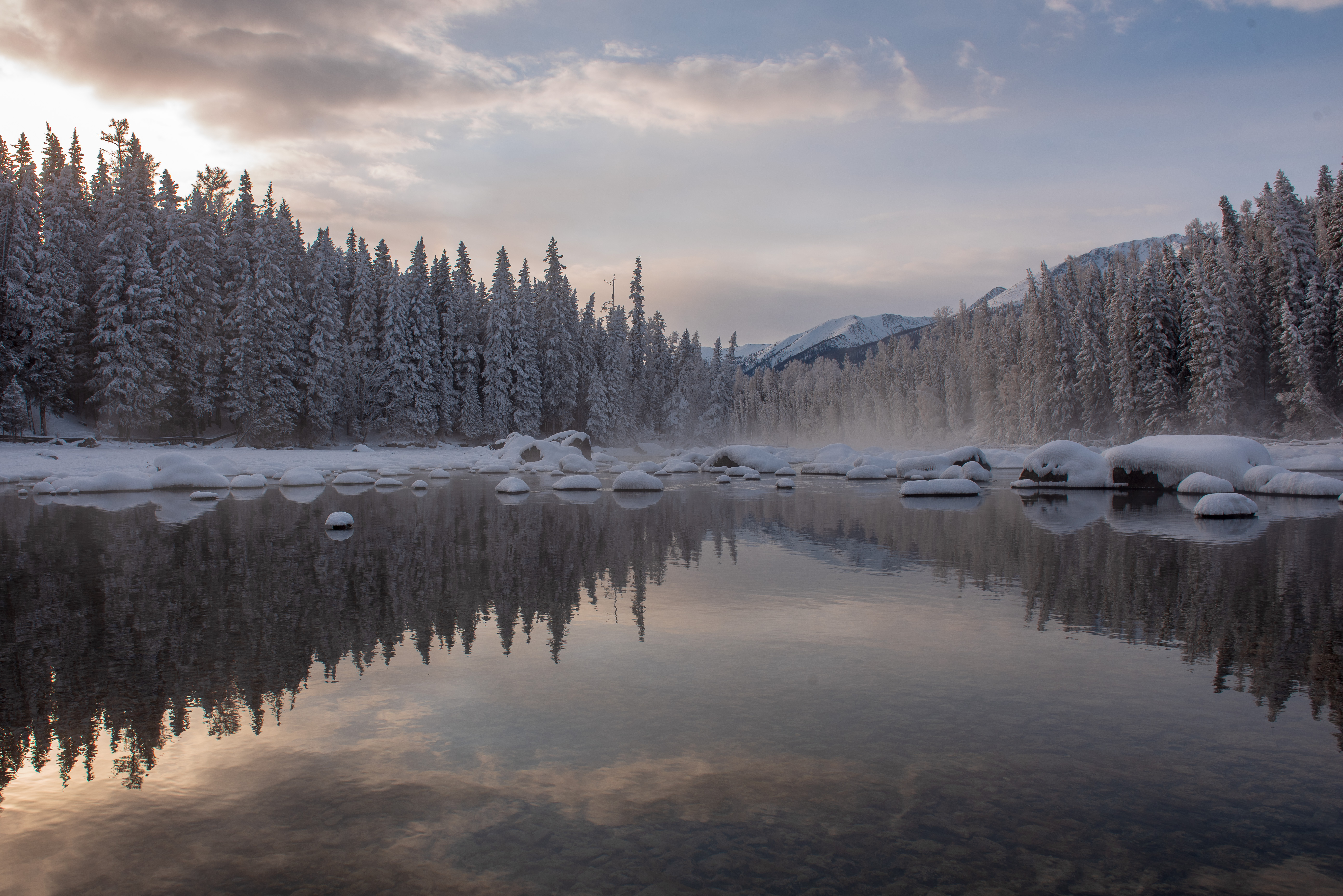 最美丽的是水面上一朵朵的雪蘑菇,雪蘑菇当然不是真的蘑菇,而是水面的石头被裹上一层厚厚的积雪,形状好像蘑菇,因而得名。