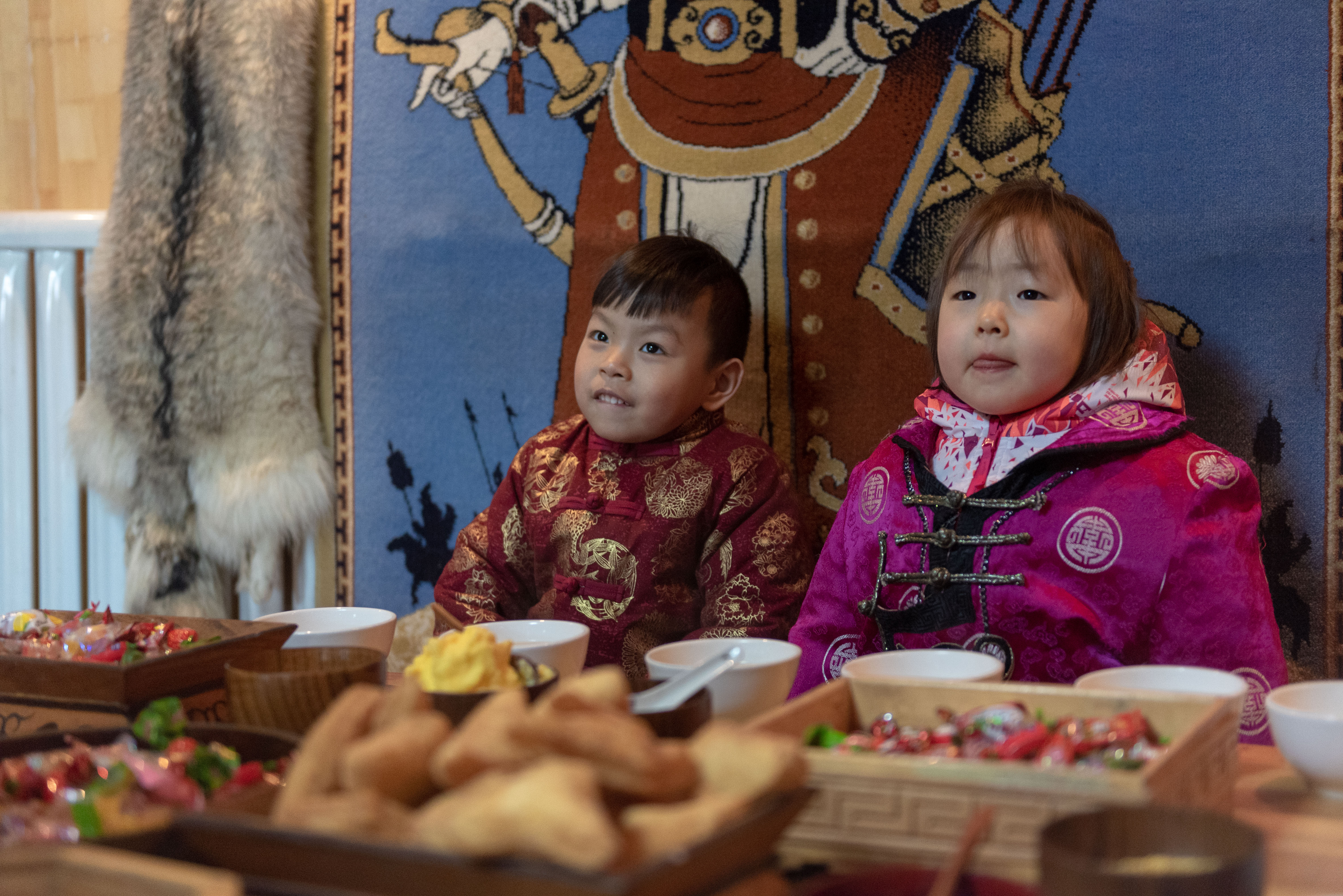主人让我们都换上图瓦人的传统服装,把最里面的位置让给最尊贵的客人,在我们这里,自然是两个小娃娃最贵了。
