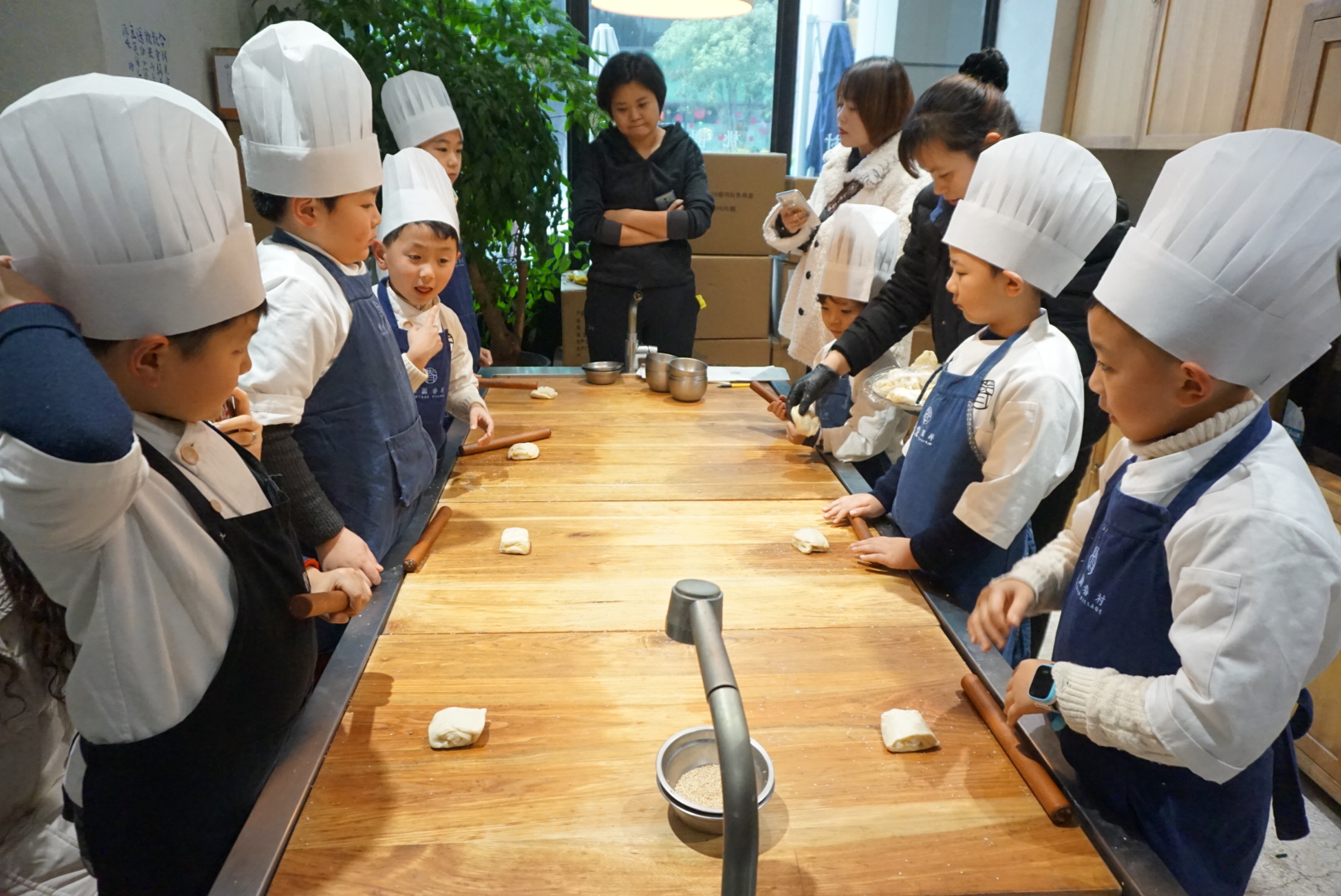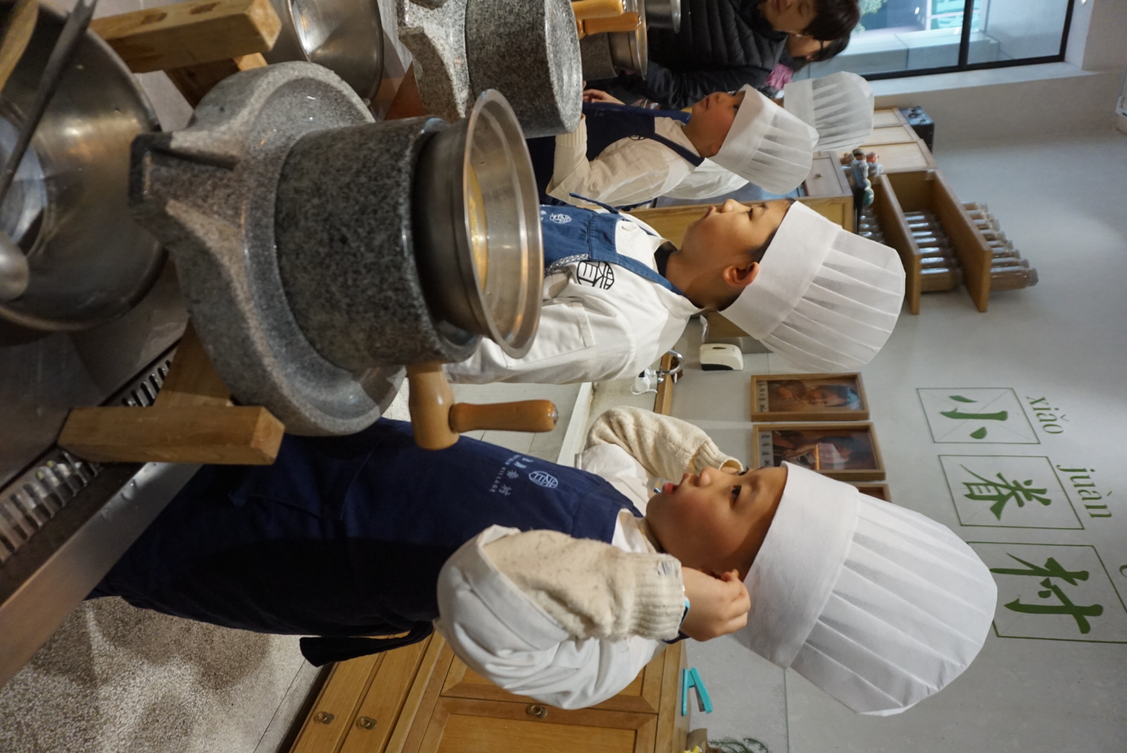 第二步:一半小朋友先做豆浆,一半小朋友做烧饼,分发材料准备制作;