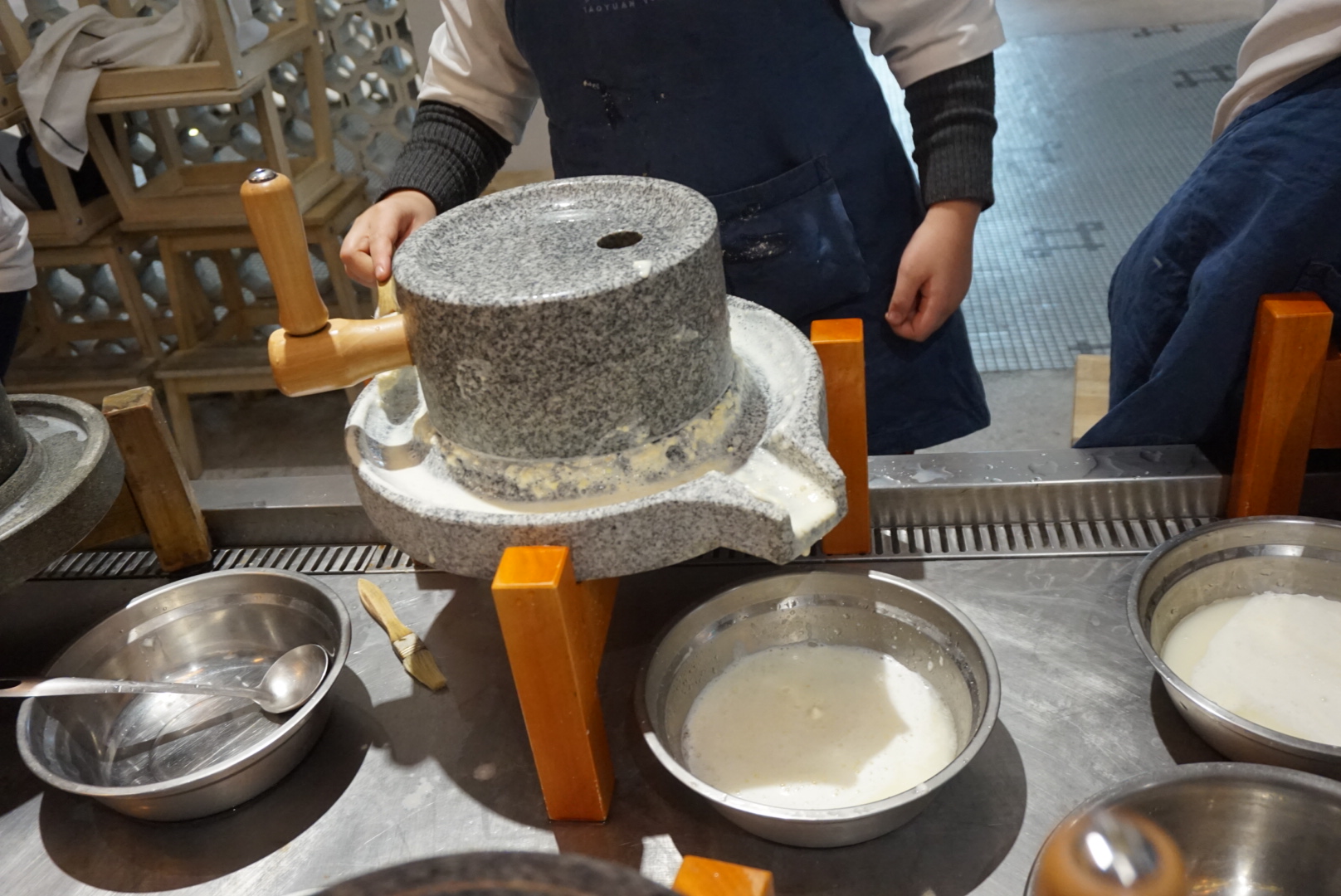 以为就把豆子磨完就好了吗,才不是哦!要把第一次磨完的豆汁再倒入石墨中,继续磨第二遍,这样磨出来的豆浆才能够更加丝滑哦~
