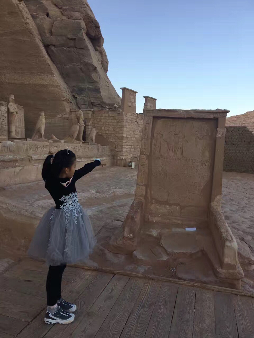 来时飞机上,女儿对我说:“妈妈,《国际理解》书里说,埃及神庙里有个房间,每年2月21日太阳光会直射进来。” 原来她说的就是阿布新贝神庙内的最里面的神龛。里面是黑暗神、太阳神、拉美西斯二世、太阳神四个雕像。每年2月21日和10月21日两次太阳光会直射进来,一次是为拉美西斯庆生,一次是庆祝他登基大典。第幅为小阿贝门右侧,上面的象形文字是拉美西斯二世说给他心爱的女人的,意思是“我被你迷住了”😄