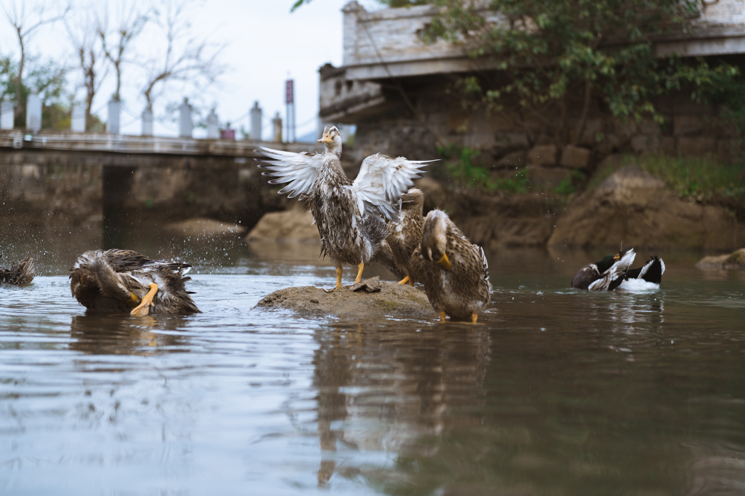 第一次见鸭子洗澡,而且还是一群鸭子,画面非常有意思,我抓拍了一张鸭子展翅的画面。