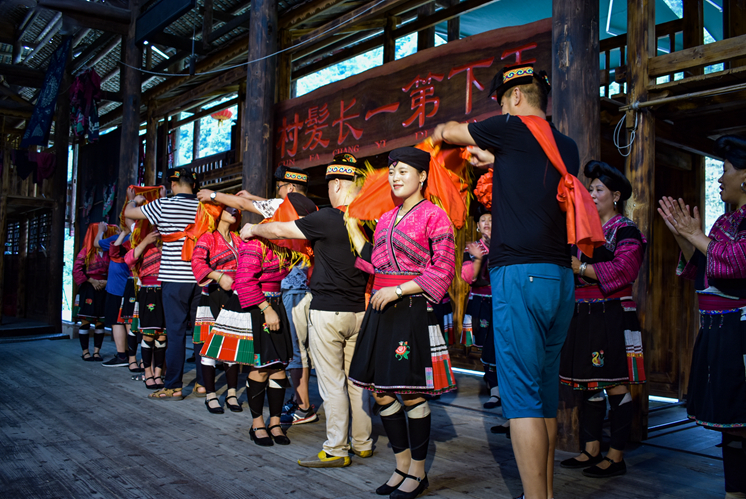 表演过程中会邀请在场的男性游客上台体验红瑶族的婚嫁习俗。在红瑶族,如果男的喜欢一个女人,就在那个女人的脚尖子上踩一脚,踩的越狠,说明对方越喜欢你;而女的若是喜欢一个男的,就在对方的屁股上狠狠地掐上一下子,当然,男的是不能回掐的。