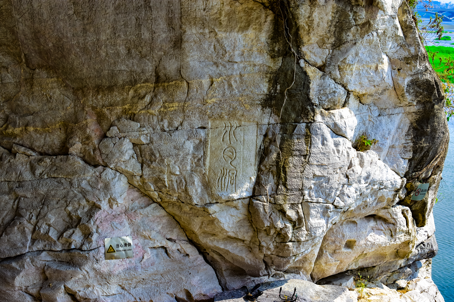 在往下走就到了水月洞,水月洞就 象山 鼻子的部分,据《 象山 记》载:"有石穴一, 彼此可以相望, 形圆而长, 其半入于漓水中, 水时高时下, 故其穴亦时有大小"。水月洞洞口 朝阳 , 亦名 朝阳 洞。但洞在水上, 如明月浮水, 十分形象, 所以水月之名, 一直沿用至今。 象山 水月是 桂林 山水一大奇景, 文人学士属文赋句, 莫不叹为观止。宋蓟北处士《水月洞》诗有"水底有明月, 水上明月浮。水流月不去, 月去水还流"之句, 细致刻画了天上、洞中, 水底月亮相互辉映的奇迹。 象山 的水月与南望的穿山月岩相对, 一悬于天, 一浮于水, 形成 漓江 双月的奇特景观。
