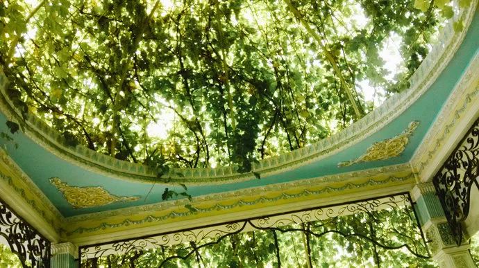 宽阔幽深的甬道,清雅玲珑的亭榭别墅,掩映在葡萄架的浓荫之中。进到葡萄沟,眼睛都会被染成绿色,到处郁郁葱葱,犹如绿色的海洋。