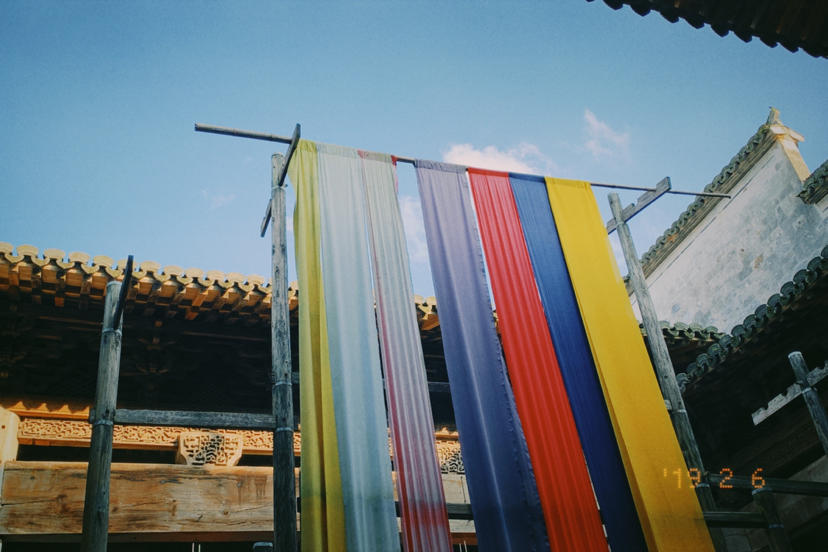 一进门祠堂正中几条彩色的的染布从高处垂到地面,周围的墙上贴着《菊豆》剧照。
