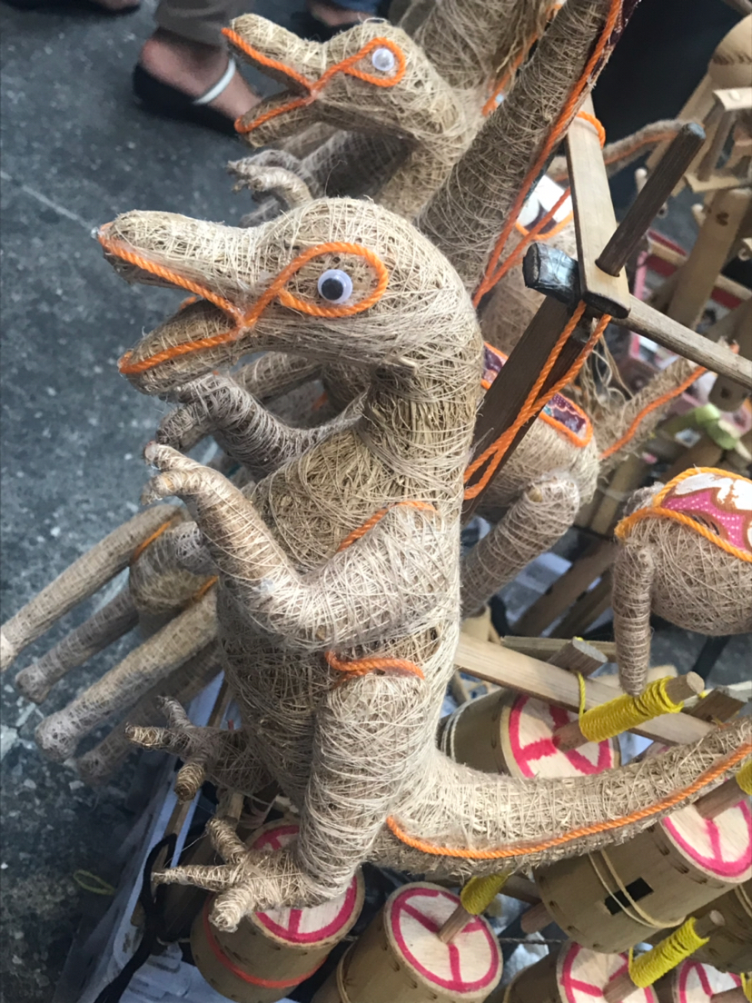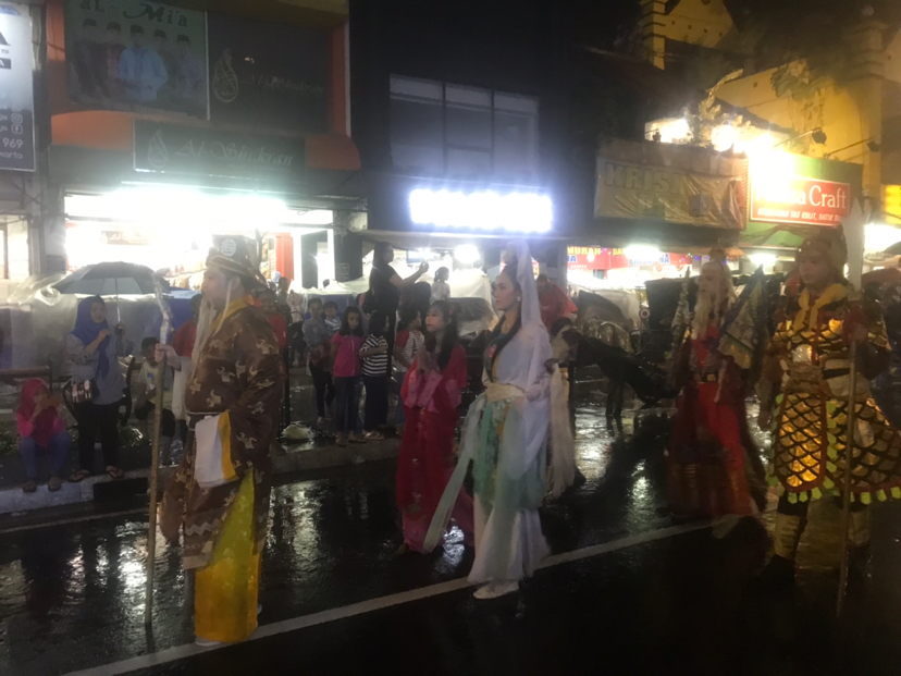 果然6点一到,警车开道,各式各样的舞龙队,神仙妖魔,唐僧师徒纷纷出马。正值雨季,忽来一阵大雨,大家都成了快乐的落汤鸡。