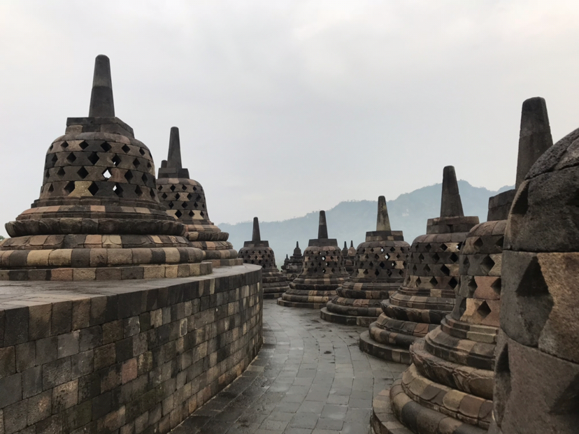 玩婆罗浮屠最经典的是3点出门看日出,我们的行程不太好改,就期待看个日落也是一样的。到的时候已经5点半了,天还在下雨,塔上三层站在好多保安,本来小导游介绍去摸佛龛里的菩萨可以祈福,都因看管过严没能得逞,上三层结构比较朴实,据说代表了“无色界”,这里值得二刷细看。