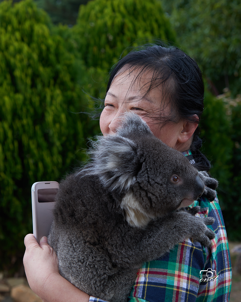 在一路上看都没看见考拉,好遗憾。现在让考拉趴在肩上亲密熊抱,乐得俺家那口子眯开眼笑!