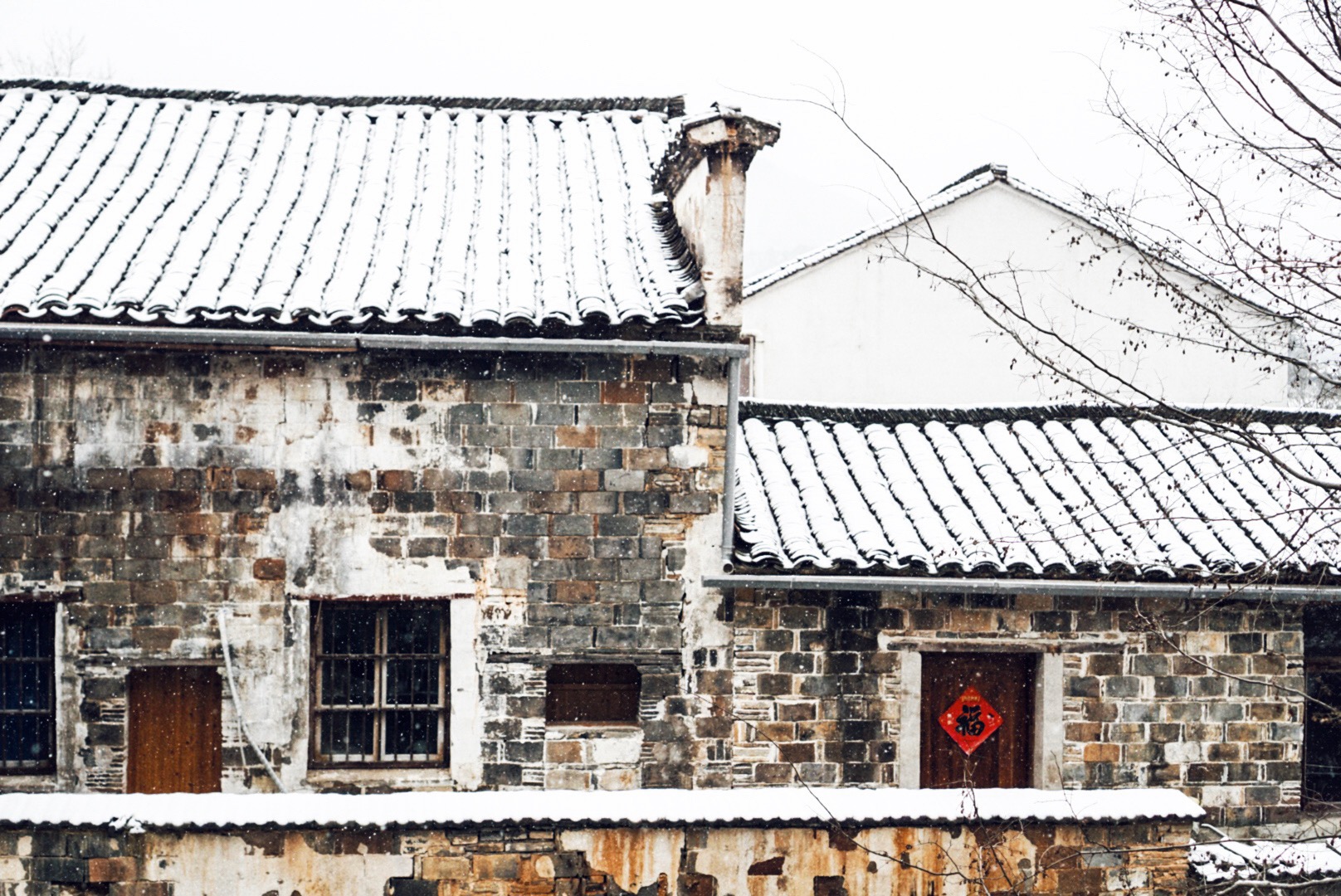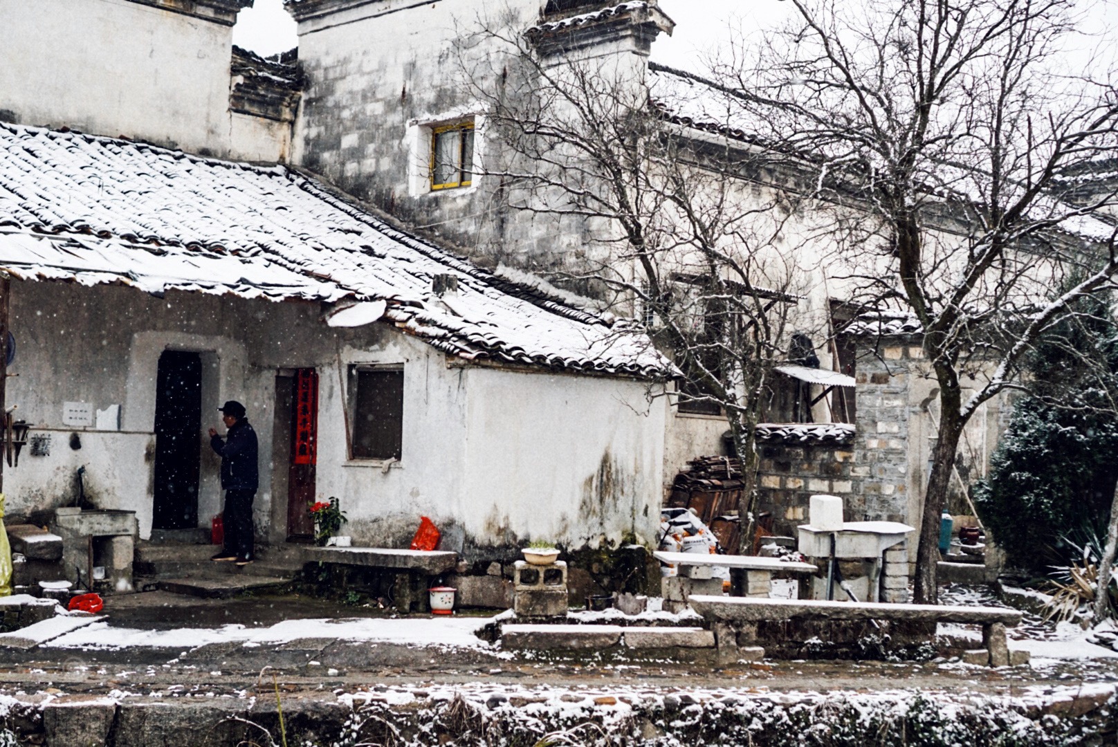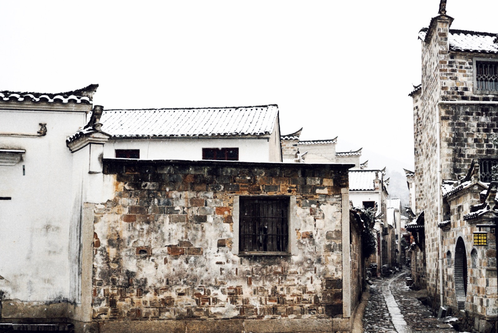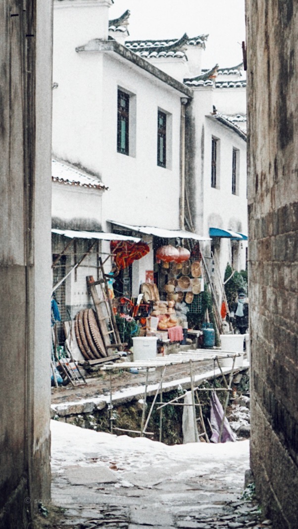 漫天飞雪,洋洋洒洒,街巷里已经有薄薄的一层积雪,雪盖满了屋顶,把查济渲染成只有黑与白两种色调,楼下小店的阿伯在清扫店前的积雪,路上匆匆而过的村妇裹紧了衣裳,打开窗户,欣喜地用手接了一些冰凉的雪花,内心雀跃且非常迫不及待地想出去与雪来个亲密地接触,连忙洗漱,便出门看雪去了。