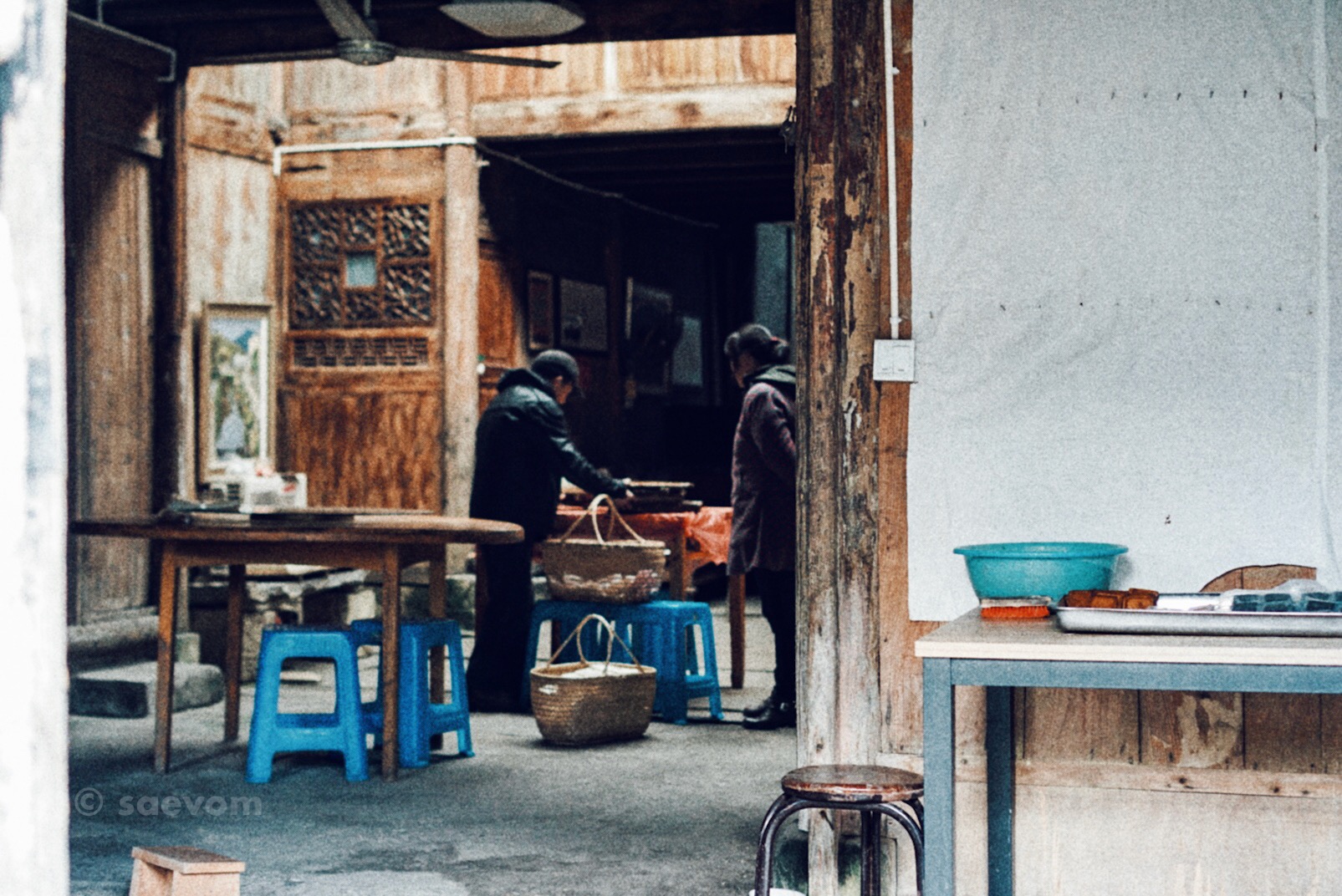 初遇查济,天是灰沉沉的,下午时分收拾完行李便背上单反出去走走瞧瞧,虽然天气不太好,但是心情是非常漂亮的,河边的小店里,坐着三两当地的村民,大家烤着火、聊着天,偶然路过一家卖酒的店面,大爷热情地招待着我进店里去品尝一下他自己酿的酒,因为不好意思尝了以后不买(本身不喜欢在景点里买特产),所以以不喜欢喝酒的理由婉拒了大爷的邀请,和大爷唠唠两句,便继续沿着河往上游走……,回到旅舍已经是天黑了,吃完饭听说明天要降温,可能会下雪,虽然是可能而已,但也是非常期待。