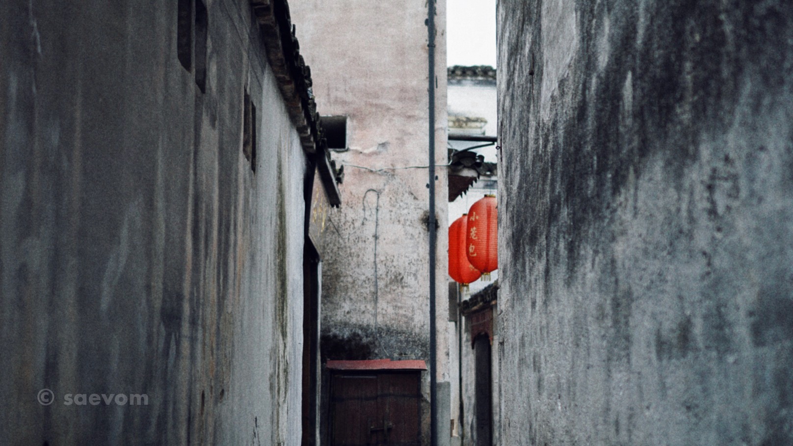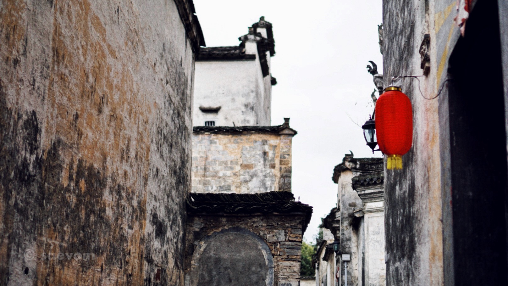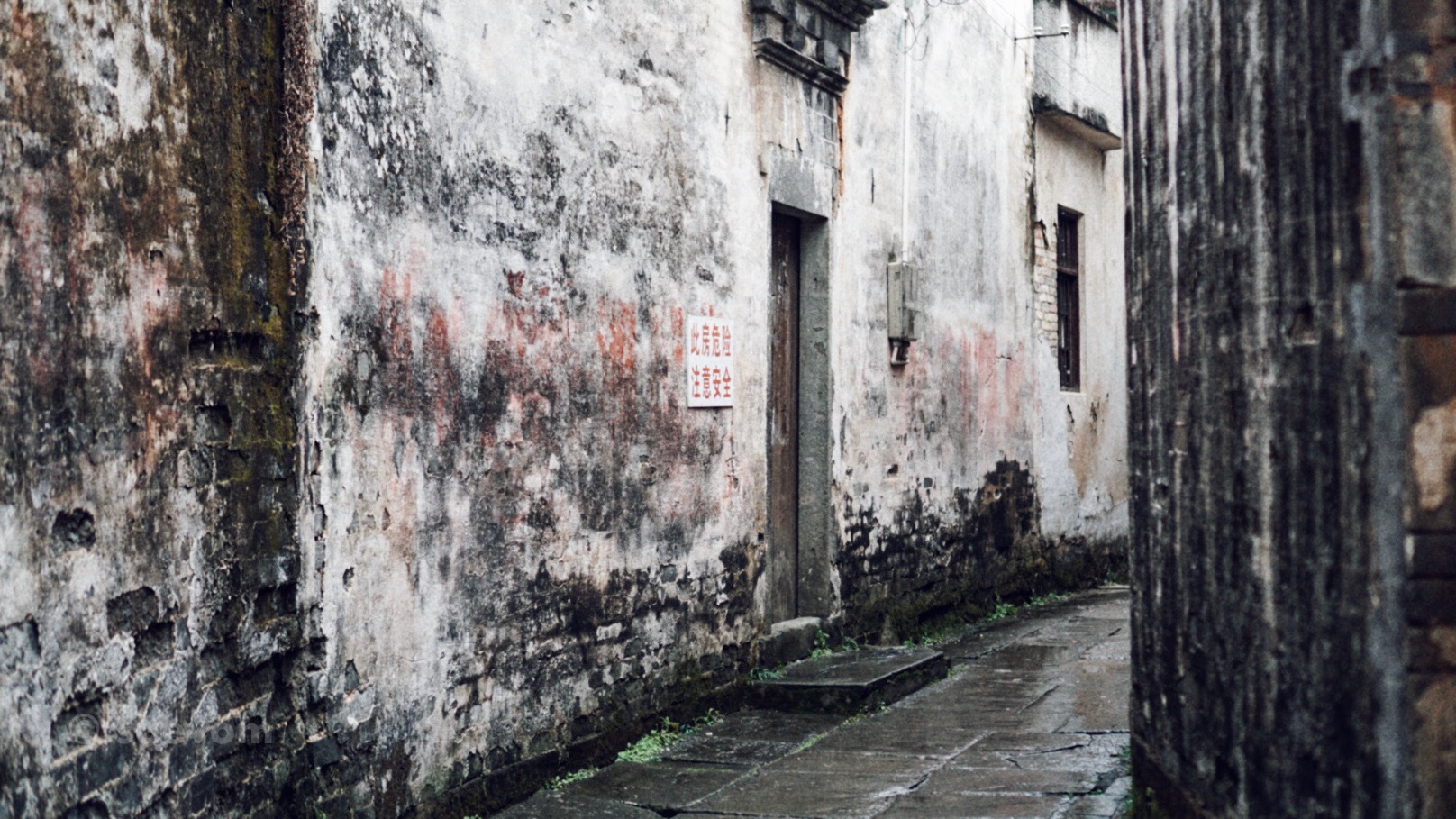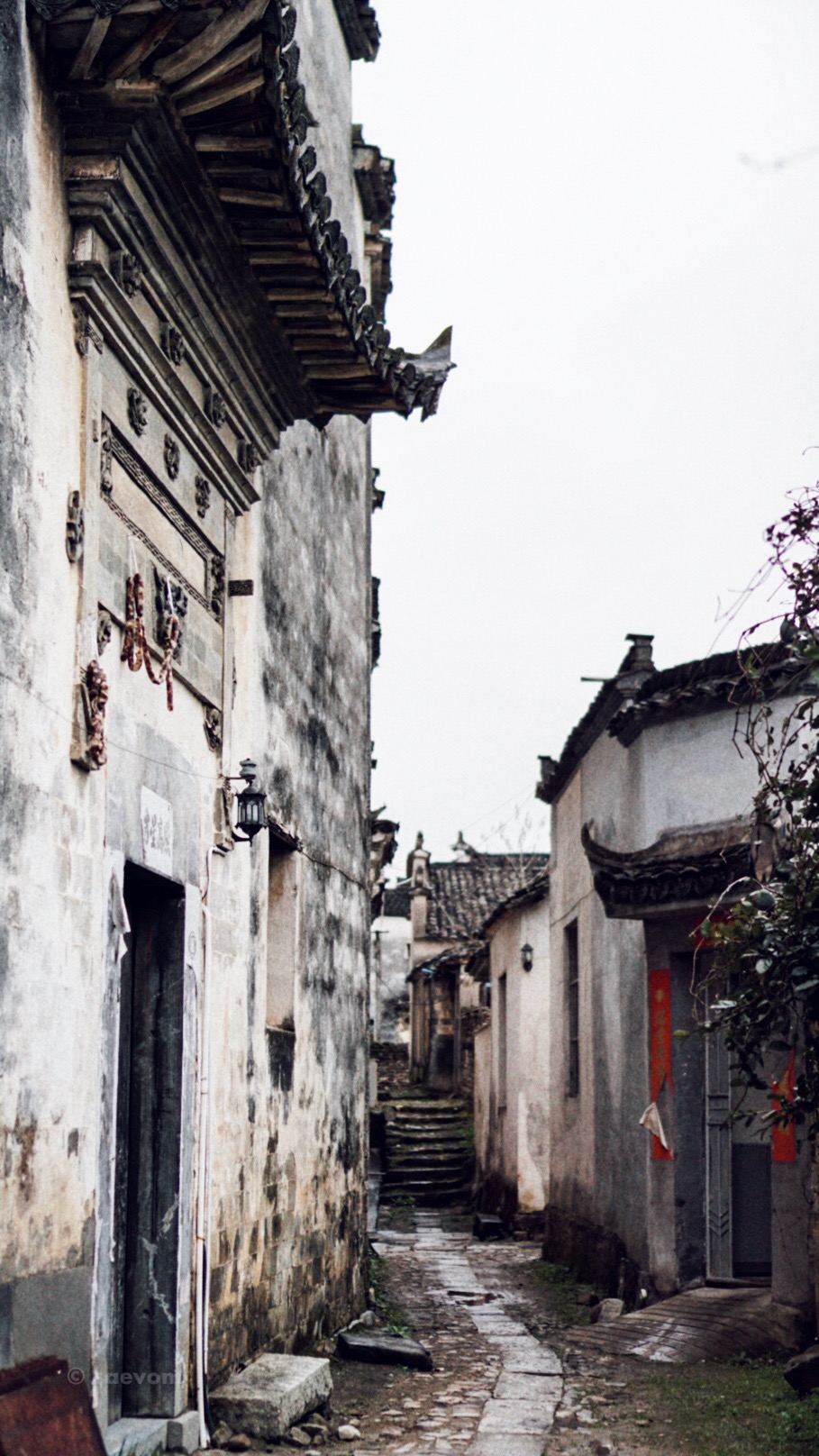 皖南地区多山,可以用在建房的用地自古就是寸土寸金,为了节约用地,徽式民居之间的过往通道都非常狭窄,形成了高墙与窄巷之间的绝配。巷子中的地面上一般都是铺有卵石或者石板,石板下大多都有挖水沟,雨水可以汇入暗沟然后排出村子外。