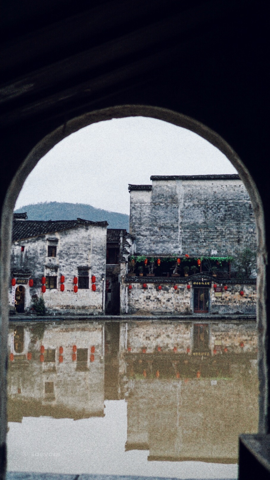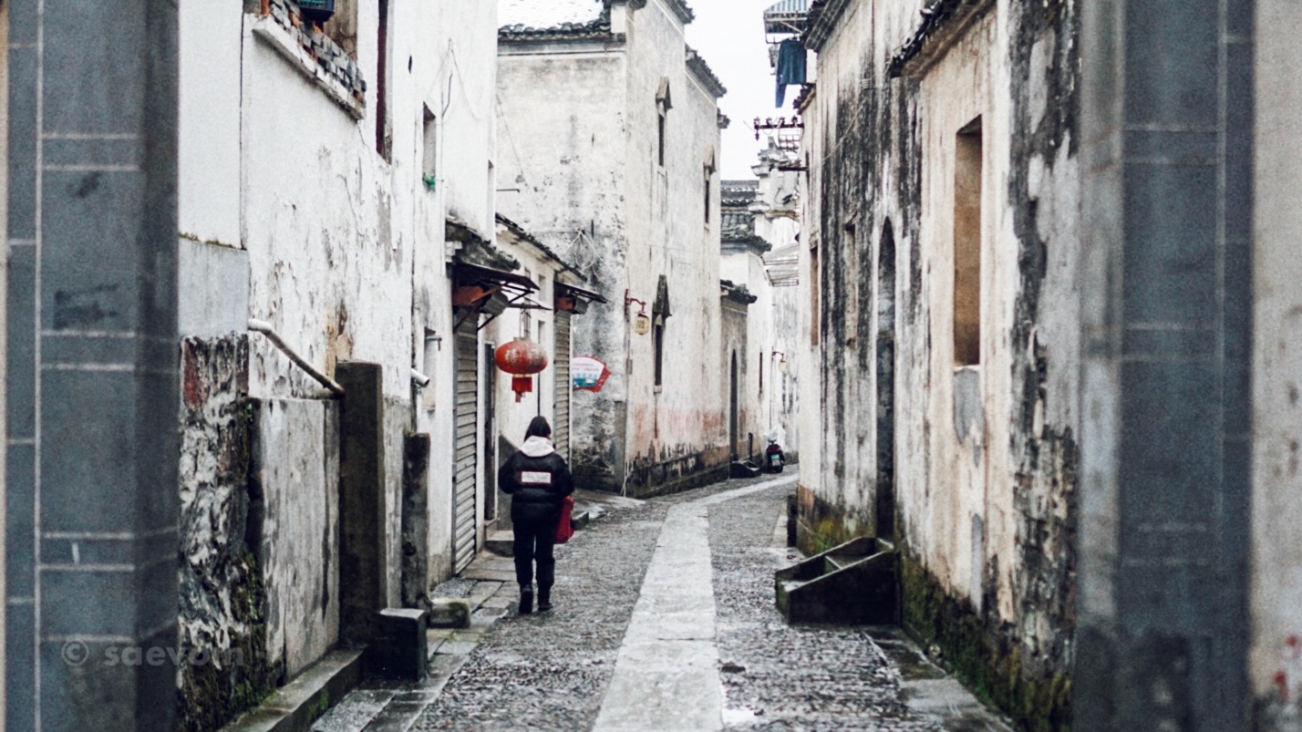 我虽然不喜欢且厌倦了满地跑的游客们,特别是熙熙攘攘的人群,还有那高音低嗓次第而来的导游解说词,但是索性是淡季来的宏村,人流不算太多。我喜欢在灰白的马头墙间穿梭,在两人宽的小巷子里腾挪,偶尔会踩上几块活动的石块板子,溅得满脚都是水,有时走进一间老屋,摸摸那几百年间的石板木雕,看着雨水打在屋檐上,落在柱壁上,在石板上聚了起来,整齐划一地向着中央而去。聚水成池,聚财也如聚水,一点一滴地积累。依山傍水、翠烟袅袅,村童嬉戏、农妇浣纱,老人们话家常,洋溢着生活的惬意。