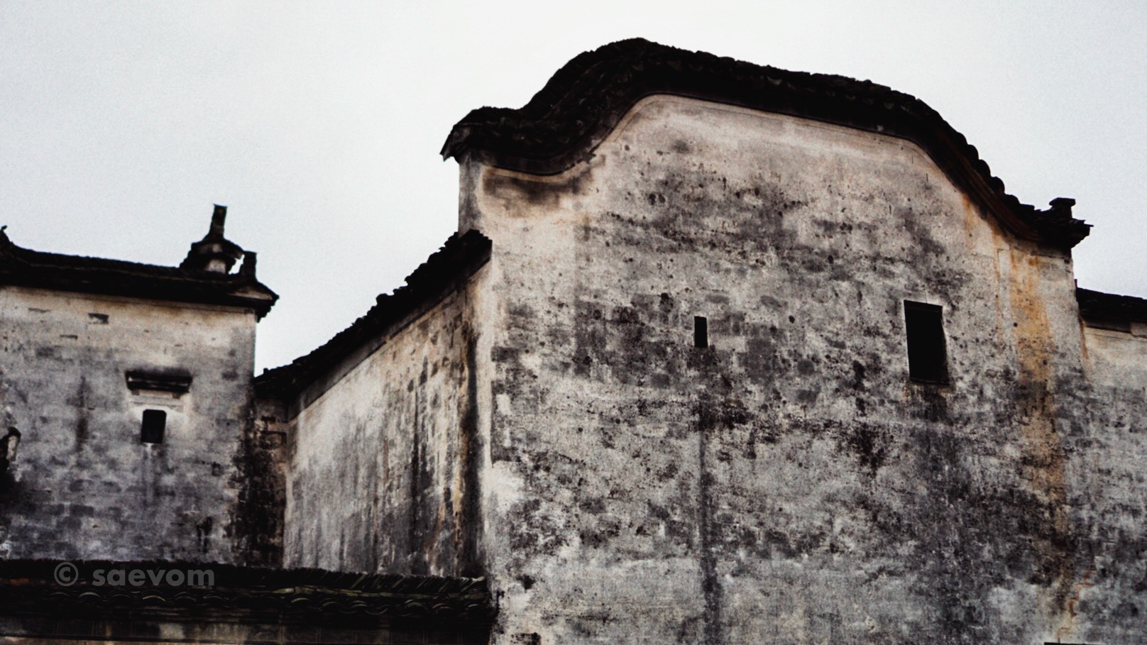 皖南徽式民居大多都是连成一片的,层层跌宕的马头墙高出屋脊,既可以挡风挡火,统一的白墙黑瓦,又形成了一条条优美的线条,更加增加了江南民居的层次韵律感。