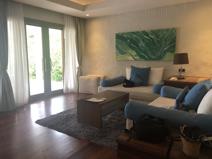 后两天的水屋是大惊喜!!!之前因为想尝试两种不同的特色。安排的两沙两水。实际上四晚水屋还有折扣。看到水屋以后我后悔死了 没住四晚水屋。音响是雅马哈。用手机连好方好音乐。 lush沐浴球也可以用了。浴缸对着大海和泳池。晚上可以看到日落。海风吹着。老公一直跟我说以后要努力赚钱每年来住